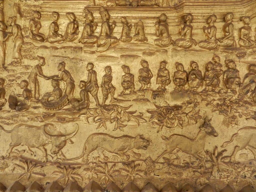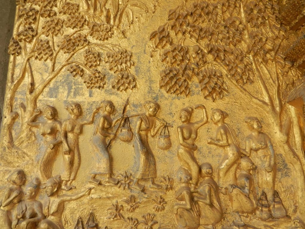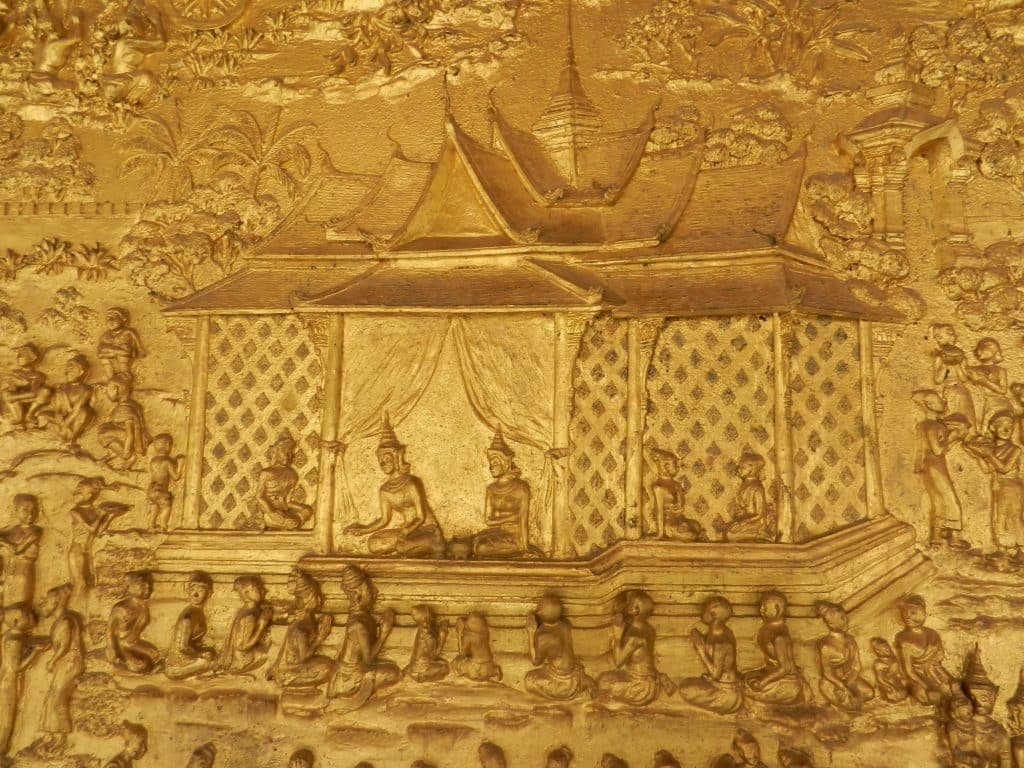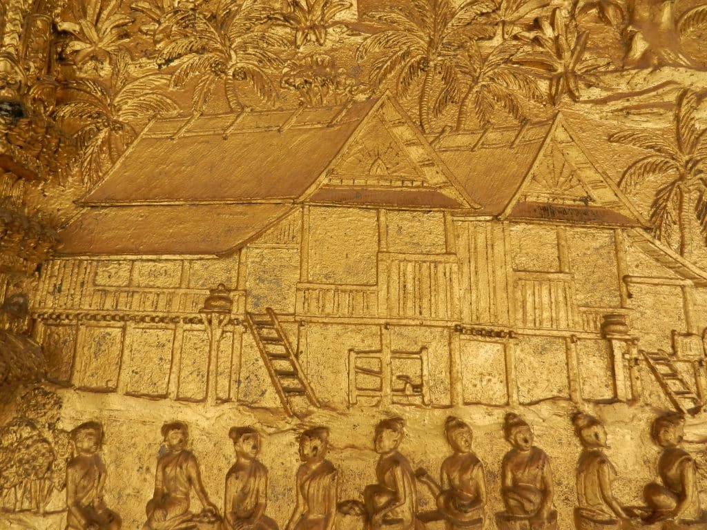 The friezes include images from the Ramayana and the Vessantara Jataka (the story of the Buddha’s most recent prior incarnation), and each tale includes palace scenes. Elegant courtly images on Wat Mai reinforced its role in Laotian palace rituals. But–