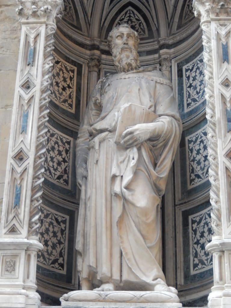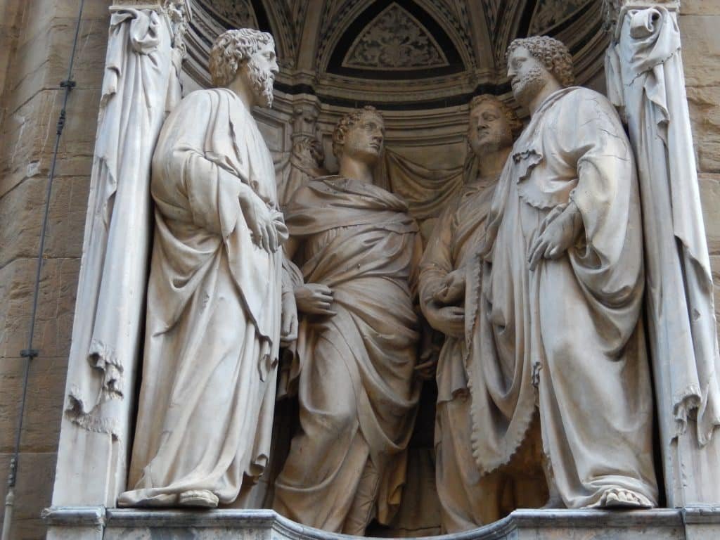 The Church of Orsanmichele was in the thick of it. It was, and still is, on the main street that leads from Florence’s cathedral to the main plaza. So when Florence’s governors decreed that Orsanmichele’s outside niches be filled with sculptures, everyone would see these art works on a daily basis.