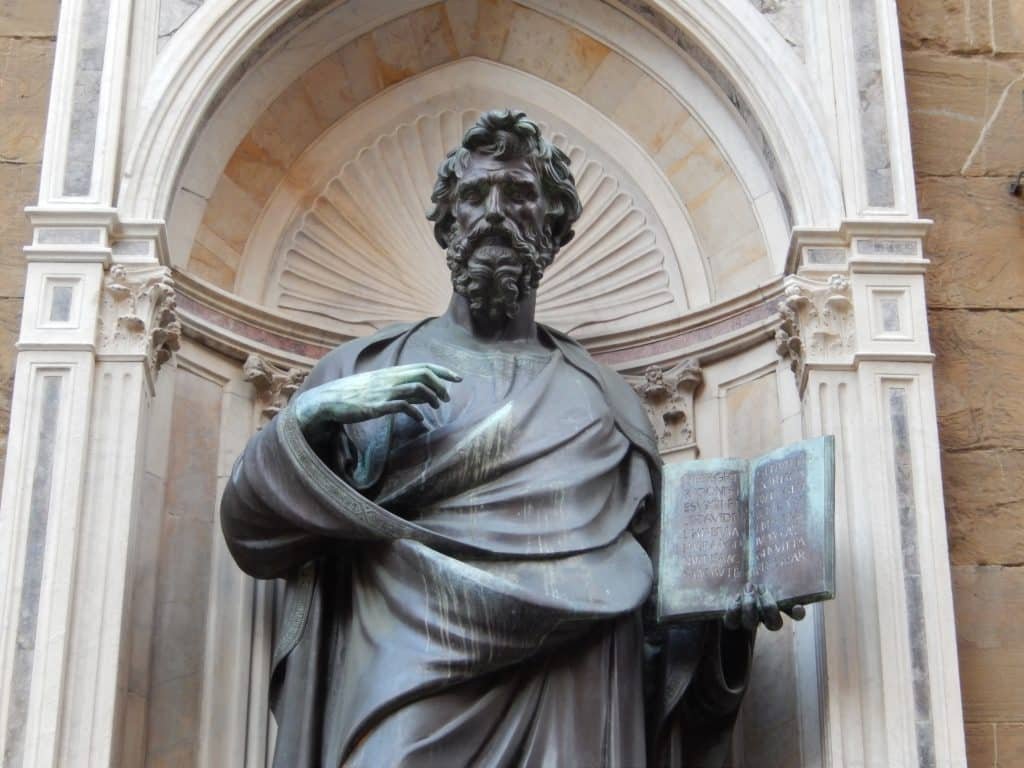His gospel is open, and he’s gesturing to it. He has a message that he wants to give passersby, and he assumes the position of a Roman orator to dramatize the importance of Jesus’ life. Donatello’s St. Mark looks into the distance. But St. Matthew pulls people into his space. He’s more animated, and he points to a real text.