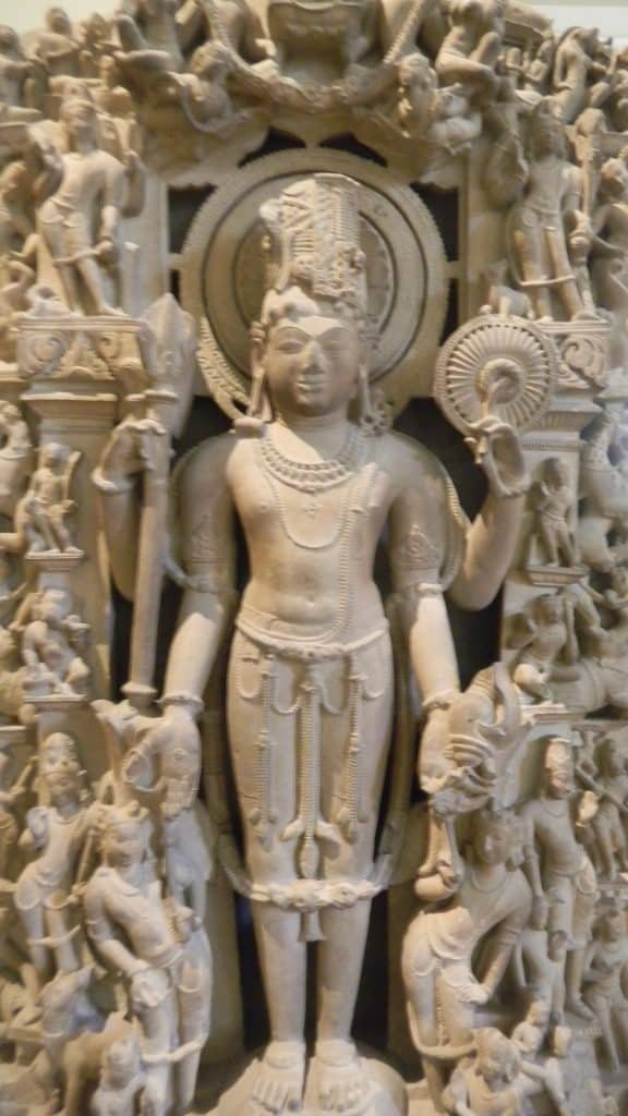 Ancient Indians’ appreciations of abundant cosmic energies inspired them to develop conventions for expanding images of gods way beyond what is physically seen. Vishnu has his four arms and hands in which he holds a disk, a conch shell, a mace, and a flower.