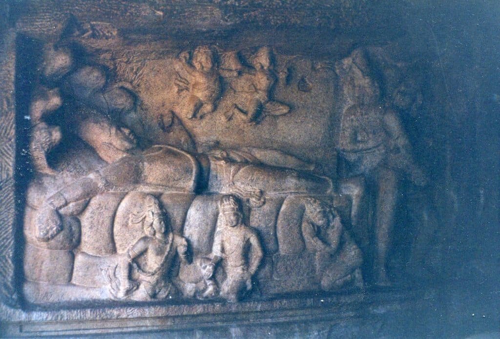 Indians’ imaginations leaped far beyond the realism in Greek and Roman sculpture, and artists made their pantheon of gods reflect the universe’s abundance. Sculptures and paintings of an enormous panorama of life forms adorned the temples that people were building. Below, Vishnu sleeps on a giant serpent before the universe begins a new cycle of creation.