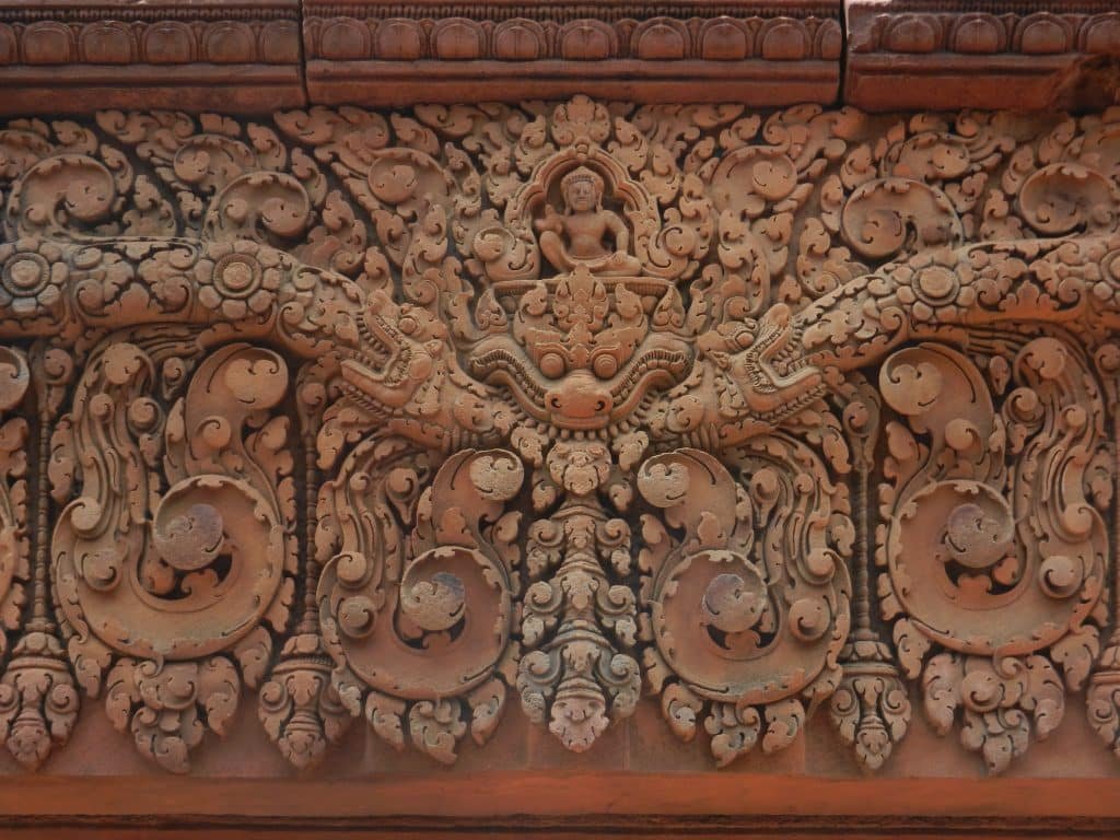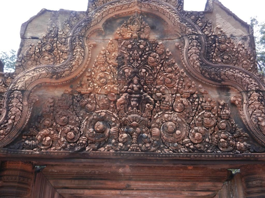4. The pink sandstone allowed traditional Khmer forms to be carved more deeply. Above, we see the lintel form with dense foliage that earlier temples like Preah Ko had. But now its depth makes it more three dimensional.