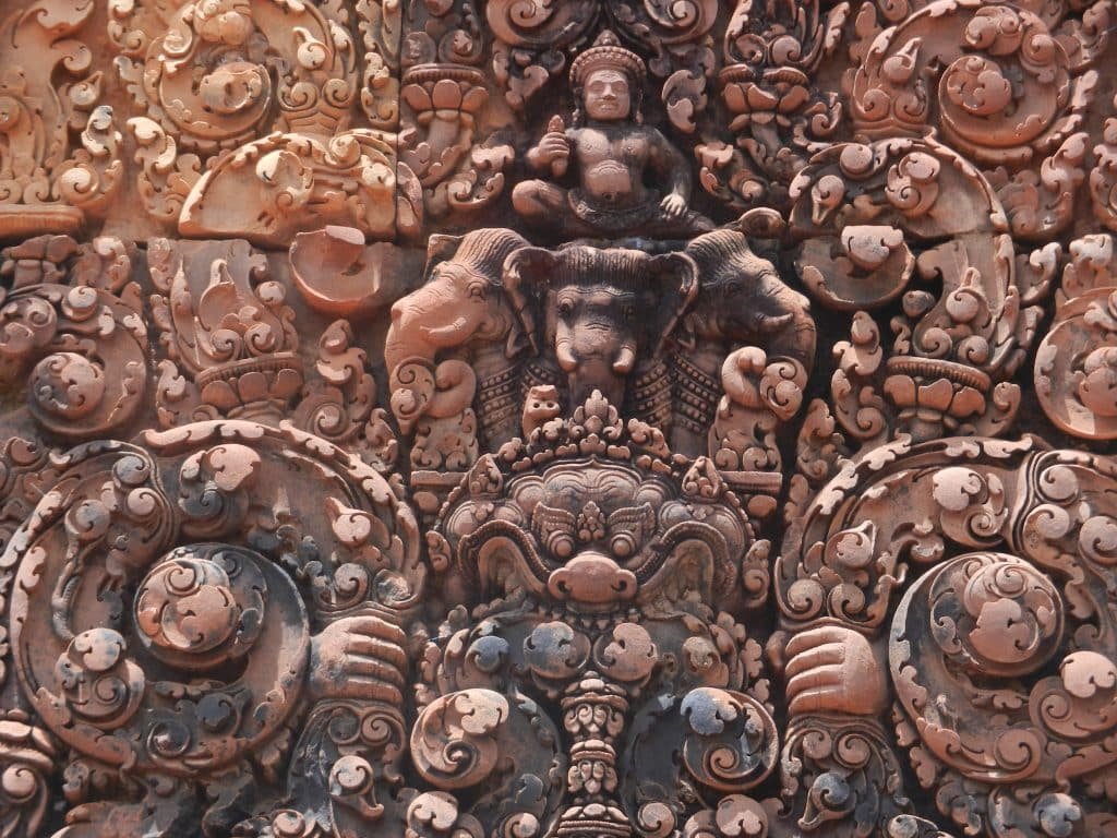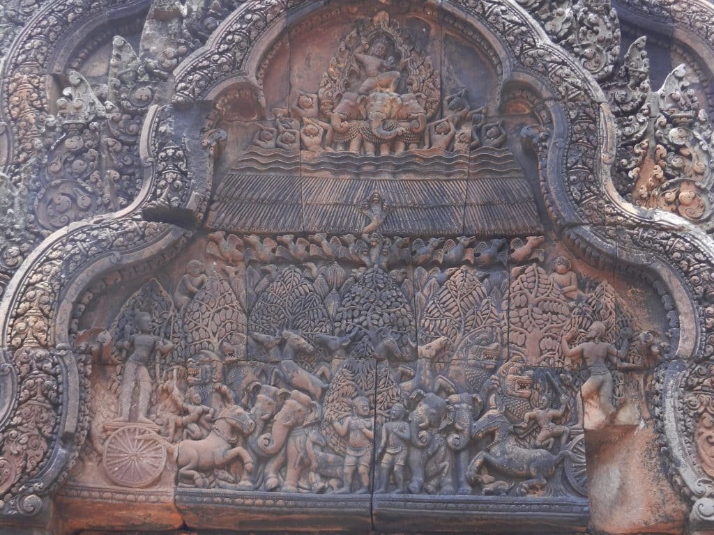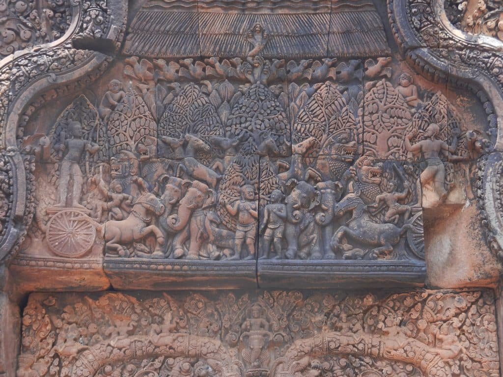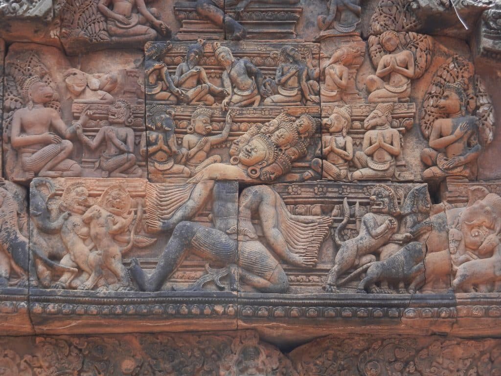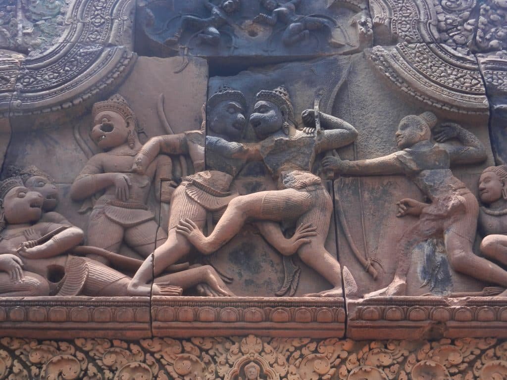 Banteay Srei also has the first Khmer carvings of large narrative scenes. Temples could now dramatize great epics like the Ramayana and advance towards the glories of Angkor Wat and the Bayon.