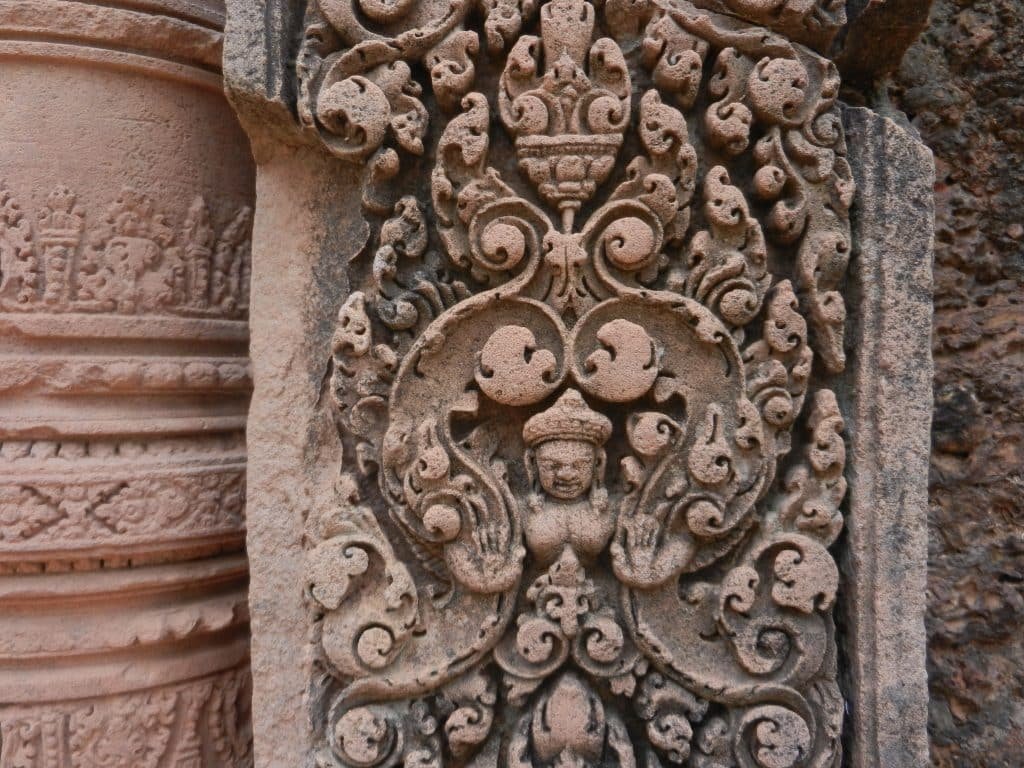 Khmer elites had also made surfaces and lines on columns and door posts as elegant and animated as possible at Preah Ko. The builders of Banteay Srei took this love of the ornate to new heights so that they also seem more three-dimensional.