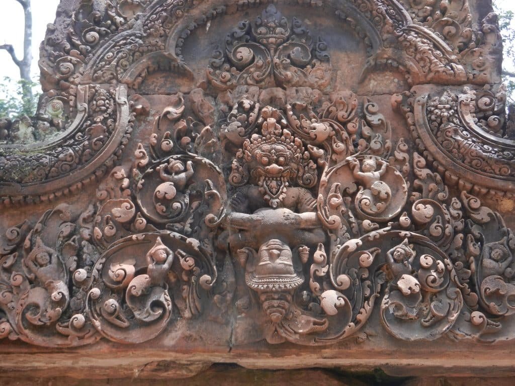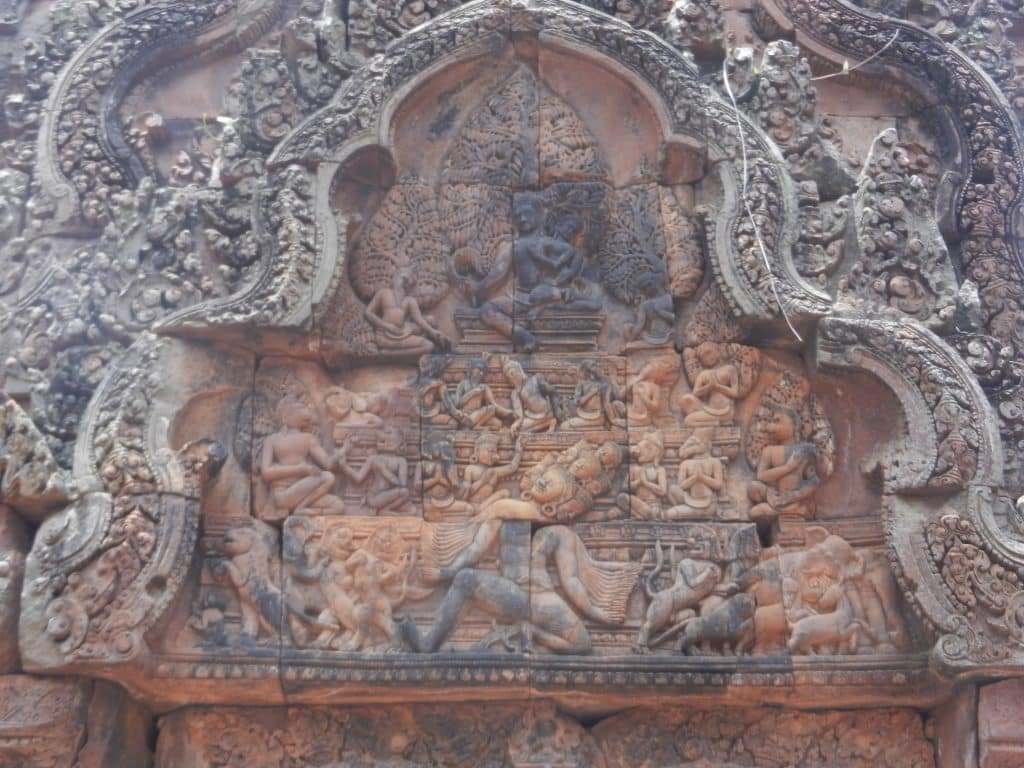 3. Now we have some action! Khmers loved lively scenes, and India provided material that matched the monsoons’ abundance. Here Vishnu has assumed one of his ten main incarnations. He’s Narasimha, a lion who conquered some of the world’s nastiest beasts. Here, an asura (demon) king called Hiranyakasipu gets the business end of his fangs. This idea follows the Khmer tradition of identifying the king with Hindu gods and thereby bolstering his image as a pillar of order. Banteay Srei projects this motif with new standards of realism and elegance.