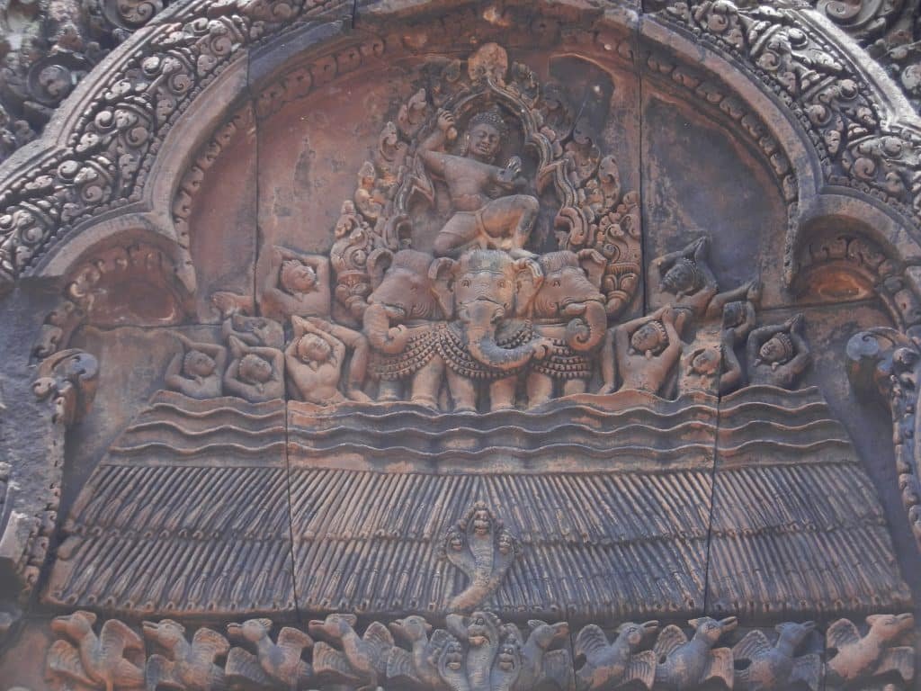 At least it was Indian mythology’s version of the vehicle that many Indians today meditate on. But in ancient India, Indra and the elephant were both associated with rain from the monsoon. The Khmers carved several images of Indra on his mount at Banteay Srei. The dense garlands around Indra look like animated clouds as though this carving will bring the rains with sympathetic magic.
