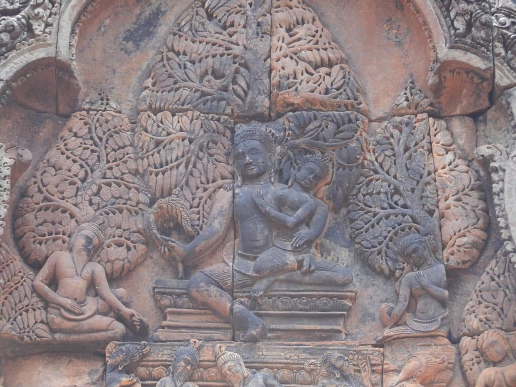 Banteay Srei was dedicated to Shiva, so we better give him equal honor. The above image is from the south library, Here, he and his wife, Parvati, recline on Mount Kailasa, their traditional abode. Underneath, Ravana tries to disrupt them by shaking the mountain.