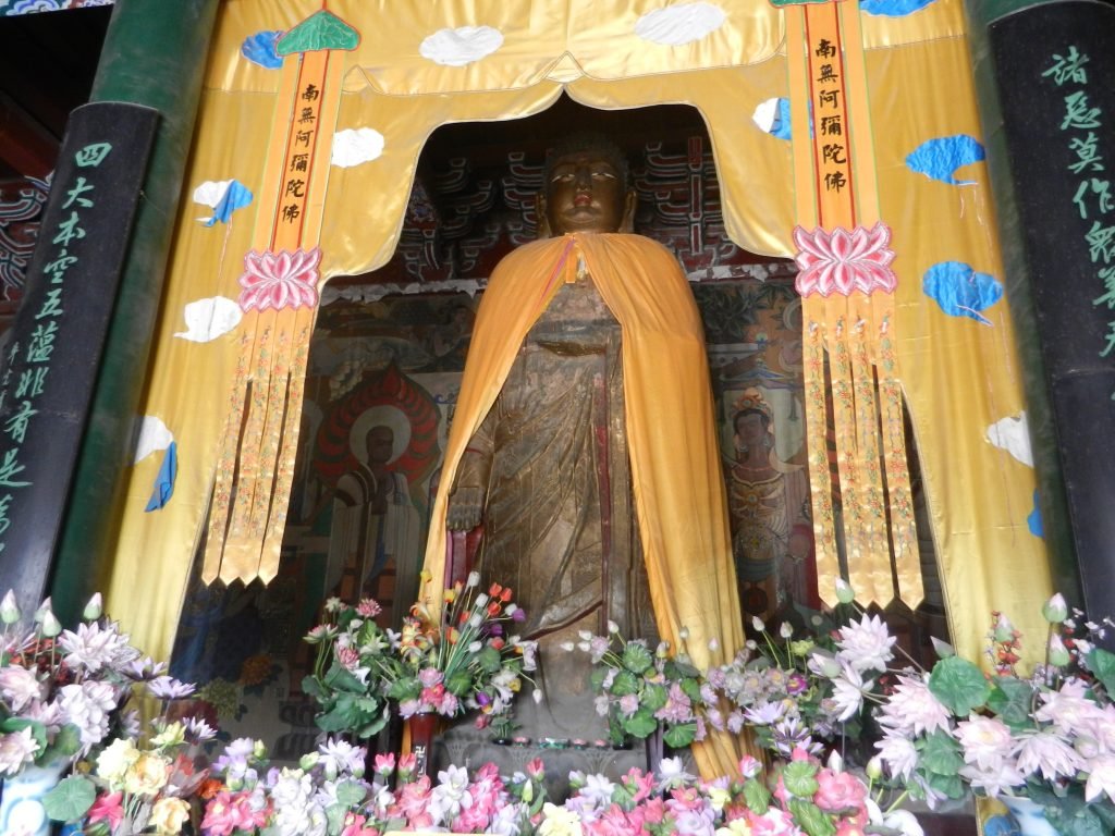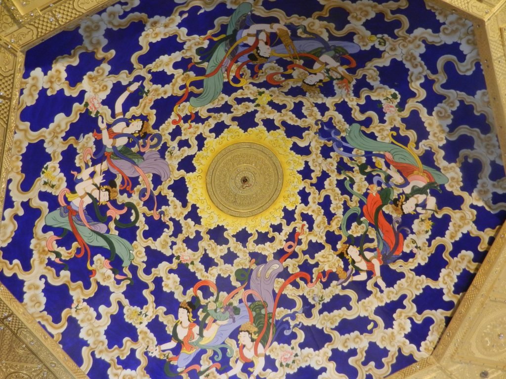 Historians have noted that many people in China have been attracted to Buddhism for reasons that are more tangible than speculations about infinite vastness. Kenneth Ch’en wrote that the faith’s fundamental idea that life is full of suffering is dramatically different in spirit from traditional China’s positive views of the world, with assumptions about harmony throughout nature and the central importance of the family and the political center. The cheerful art photo is in the White Horse Temple in Nanjing.