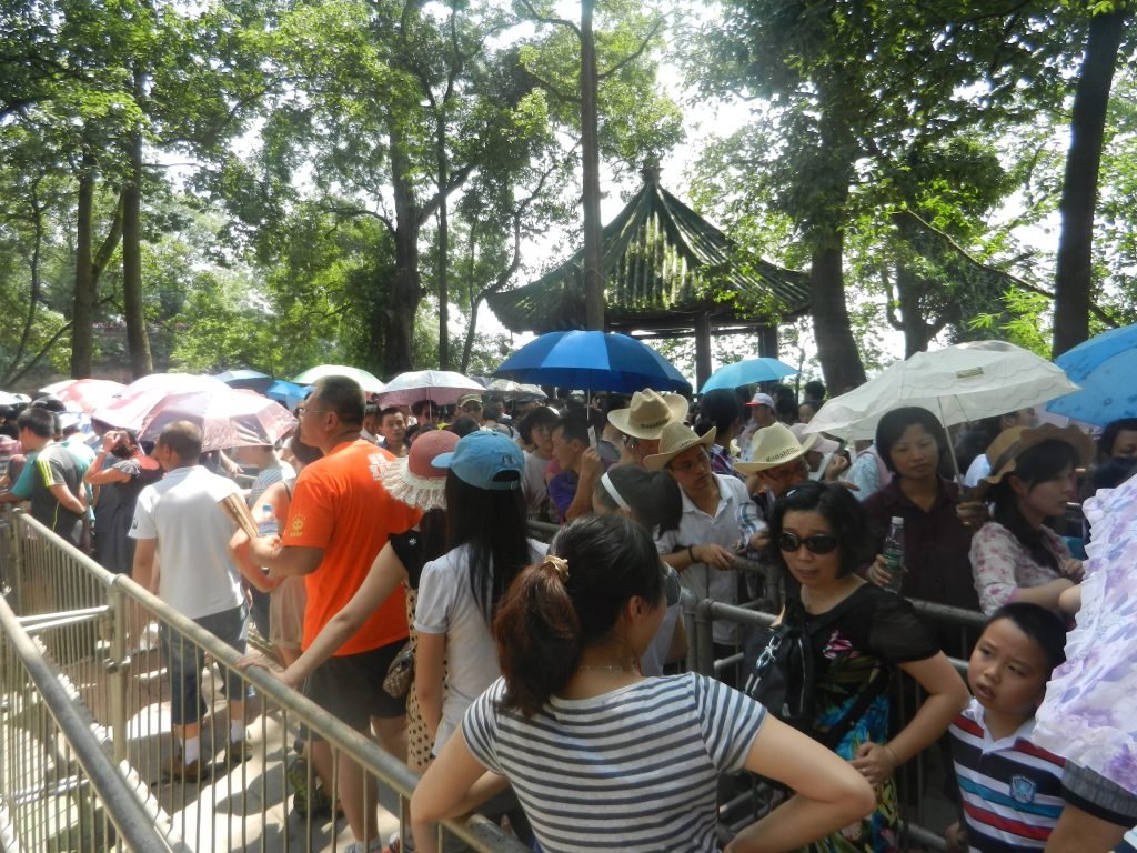 Most people I saw at famous Buddhist sites behaved like tourists, chatting with each other and snapping photos rather than meditating. Above, the crowd at Leshan is making a toasty day feel even hotter.