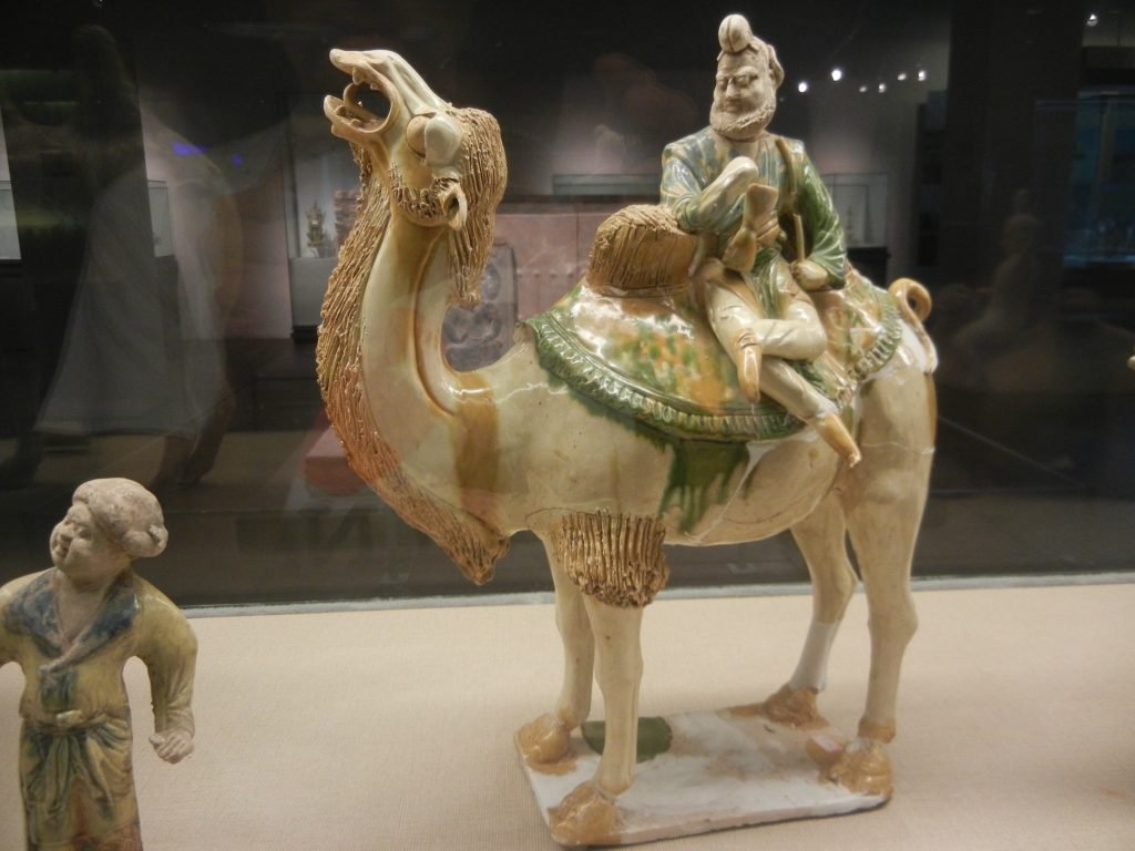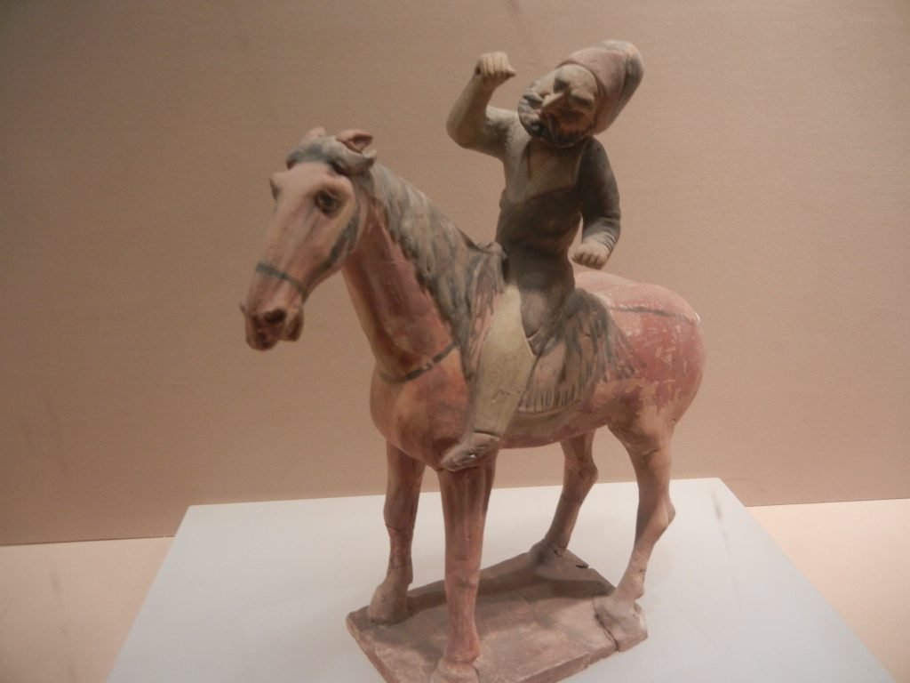 They were created during the Tang Dynasty (618-907). Trade grew along the Silk Road in the early Tang and through southeastern port cities (especially in the later Tang). Merchants, political envoys, Buddhist pilgrims, and vagabonds from Central Asia, Southeast Asia, Korea, and Japan went to China to live, and the Tang became the most cosmopolitan dynasty in China’s history. But this guy on the horse isn’t portrayed in a very dignified way. Why is he so animated without any SUV drivers to yell at? His sub-Mandarin bearing suggests mixed feelings about the new diversity.