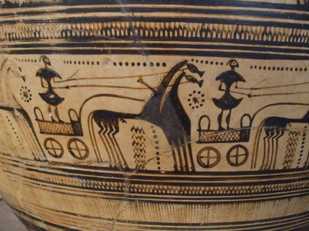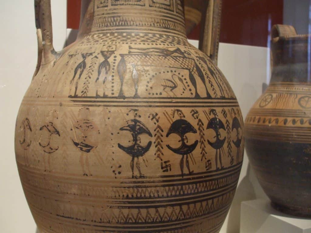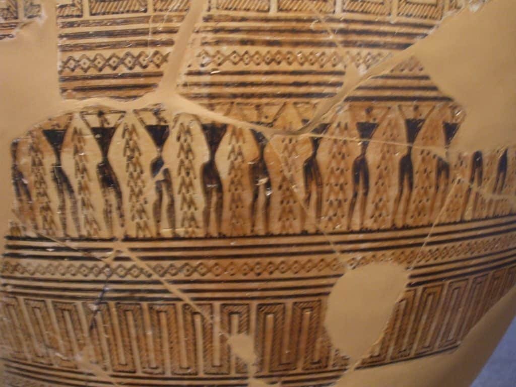 The above and two below Greek ceramic vessels were made around 700 BCE. Greeks were just beginning to paint people and narrative scenes on them after emerging from their Dark Ages. People were often reduced to abstract geometric shapes which made them distinct entities.