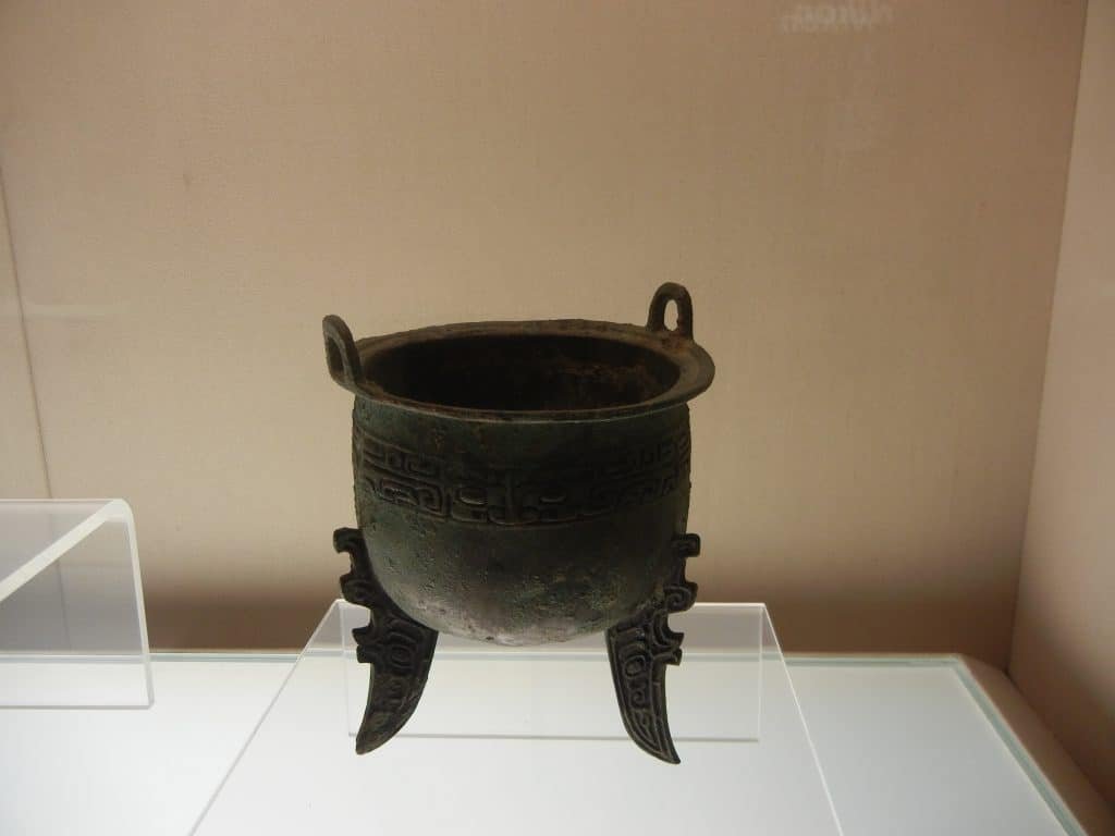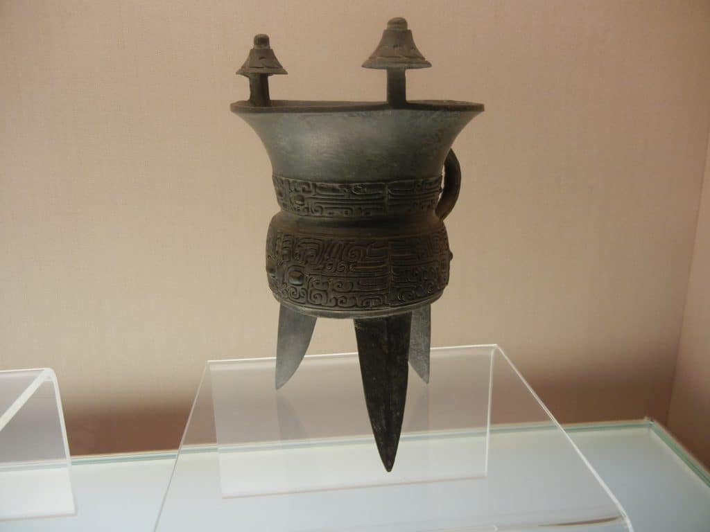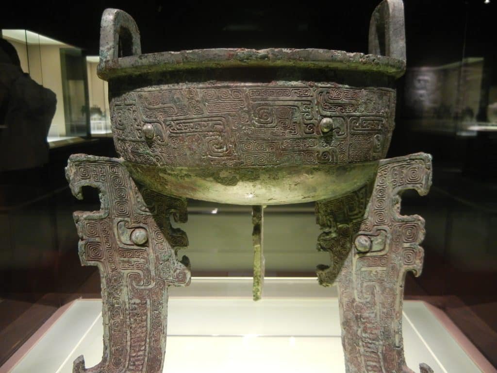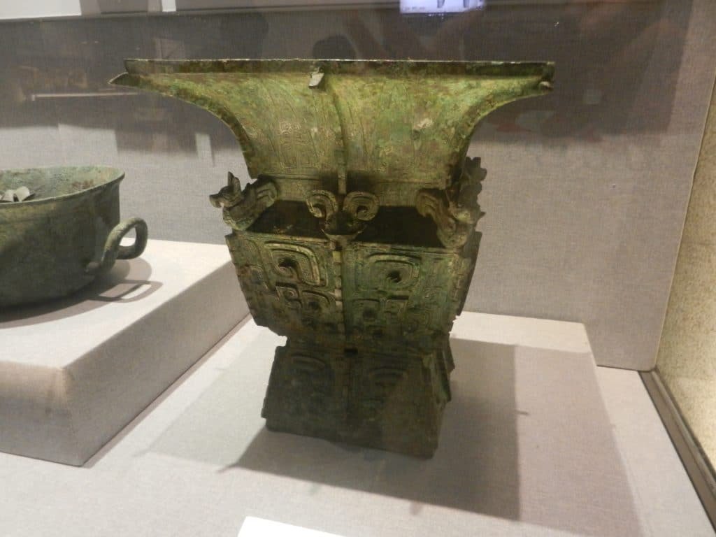 The Shang Dynasty’s royals used bronze ritual vessels to commune with their ancestors and help keep the state in order.: Their designs became increasingly dramatic to accomplish this. At first they were in a thin band around the vessel.
