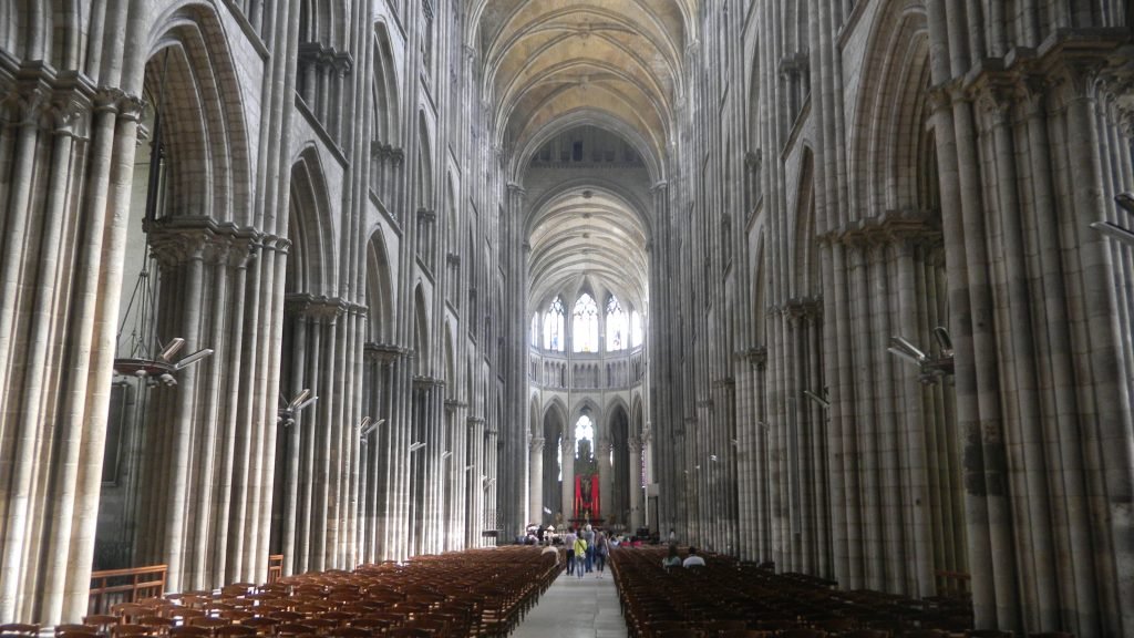 The above shot brings us from the lower beasts outside of Rouen Cathedral to the divine order inside of it. The Gothic cathedral expressed ideas of a sacred order in which all the diverse beings exist. This order is characteristically Western by being symmetrical and linear. As you can see in Gothic logic, the segments in cathedrals like Rouen are logically related, and they proceed in a line towards Christ.
