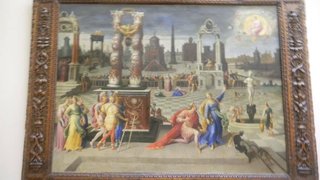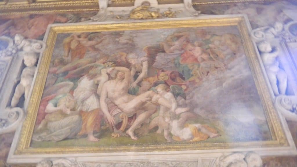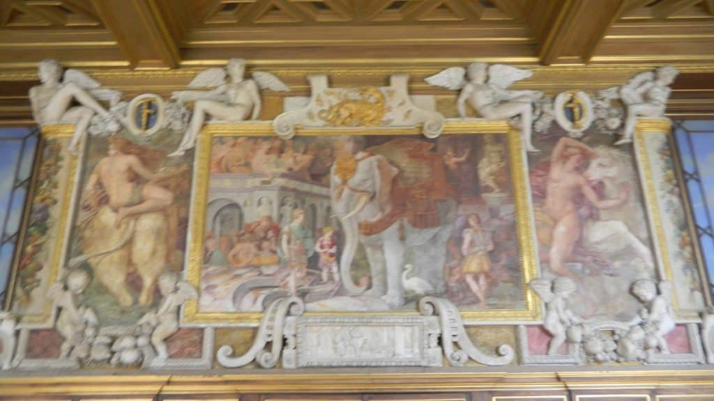 The art historian Erwin Panofsky saw a pattern in these paintings. The death and destruction stuff is more concentrated towards the end of the hall by the royal apartments. Scenes that show the universe in order are more numerous near the chapel’s end. Francois might have wanted his visitors to feel a spiritual transformation as they walked from his living quarters to the chapel.