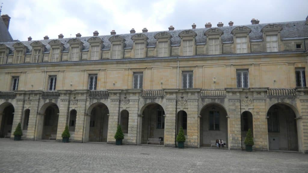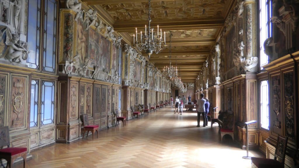 The palace of Fontainebleau (above and below) was one of his pride and joys. He enlarged it by building a long gallery between the royal apartments and a monastery that Louis IX founded in the 13th century. Inside that row of windows on the middle floor (below), he commissioned art that set standards for how France would enter the modern world and make Western culture more creative.