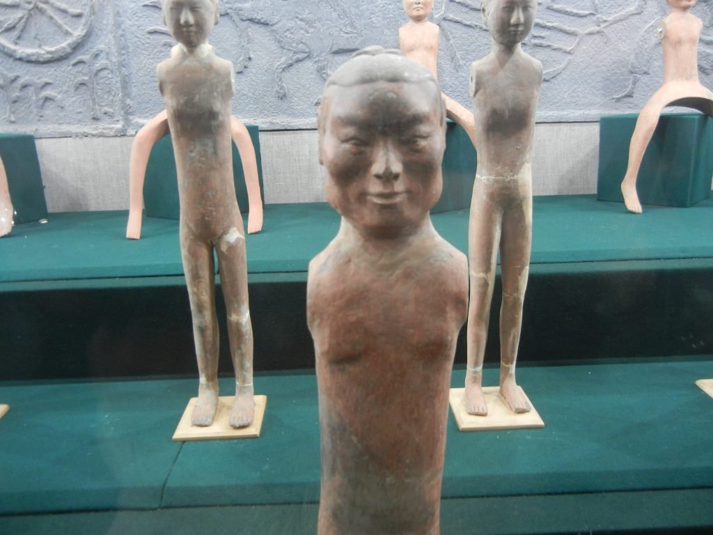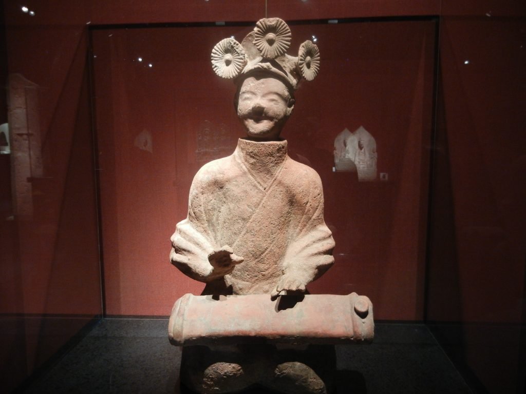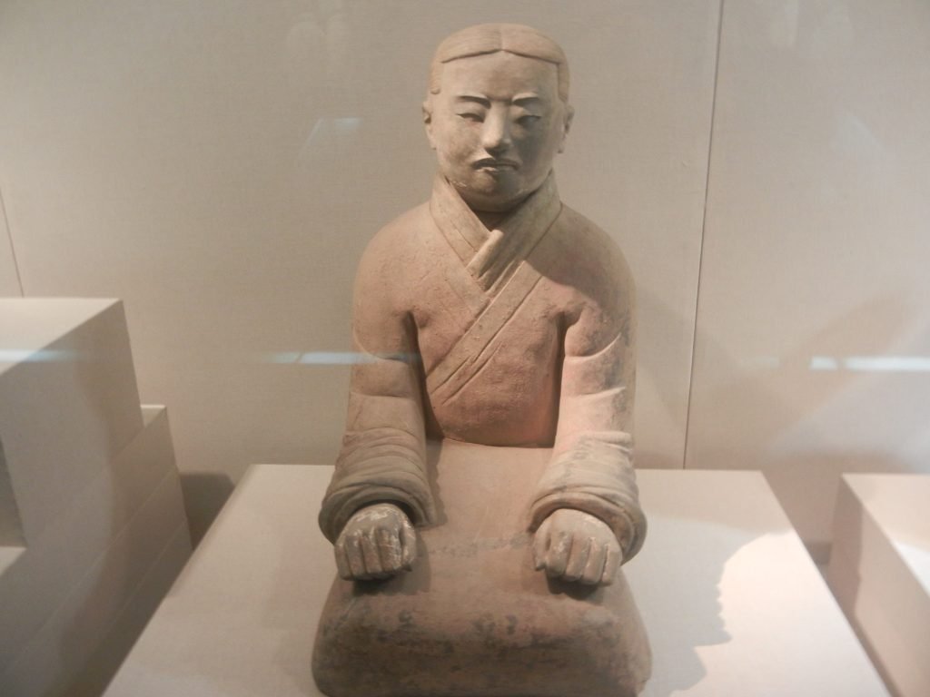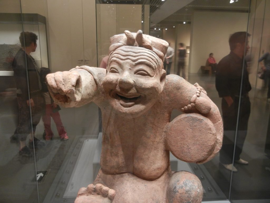 The Han Dynasty, which followed the Qin, gave it a bad rap as excessively ambitious and brutal and lacking Confucian values. Some wealthy Han people put figures like the above guy in their tombs. Entertainers who drummed and told lively stories were popular. Fun returned, and folks hoped to continue it in the afterlife.