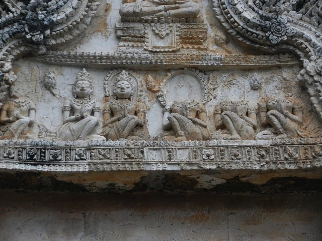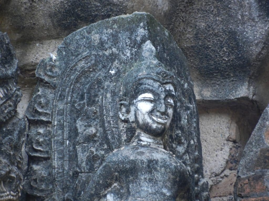 Thais also added scenes from the Buddha’s life, but softened the dignified theme. Devotees worship under him while he meditates and subdues the demon Mara. Their smiling faces look like modern reconstructions, but they fit the comical bodies, Sukhothai Buddha statues, and ancient Dvaravati sculpture. All have soft, human touches.