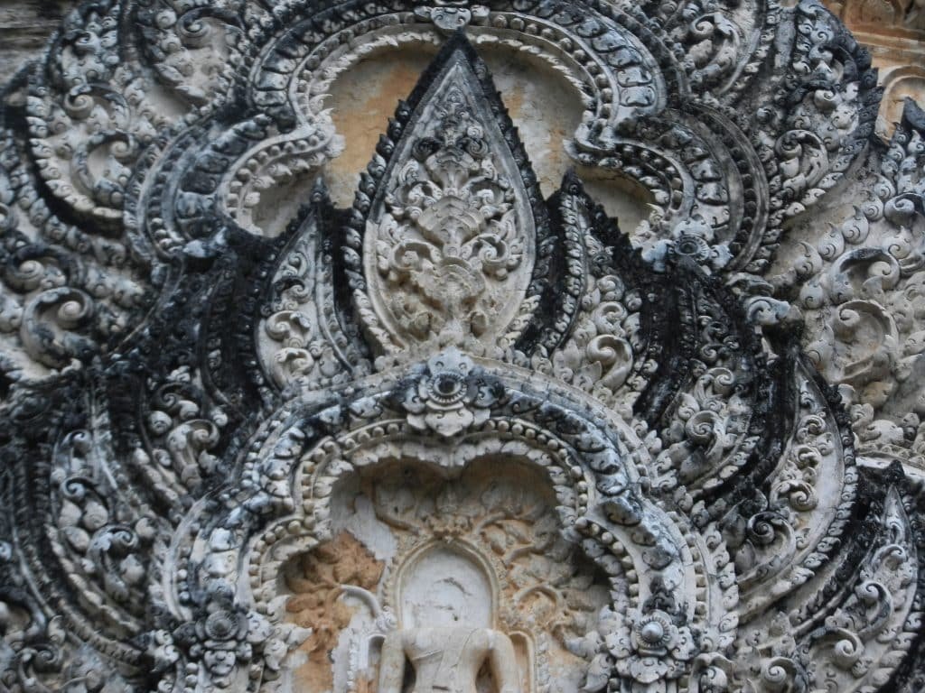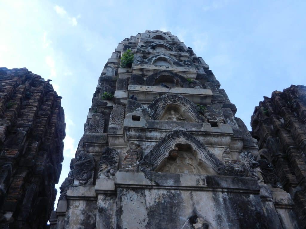 Most of Si Sawai’s towers were built by Thais. The Khmers constructed the towers at Wat Phra Phai Luang, probably during the reign of Jayavarman VII–between 1181 and 1219. Like Si Sawai, it has three, but only one is well preserved. The levels of Khmer-built towers are usually more distinct. Thais turned their stupas into a more continuous flow. They thereby began to soften the surface at Wat Phra Phai Luang.