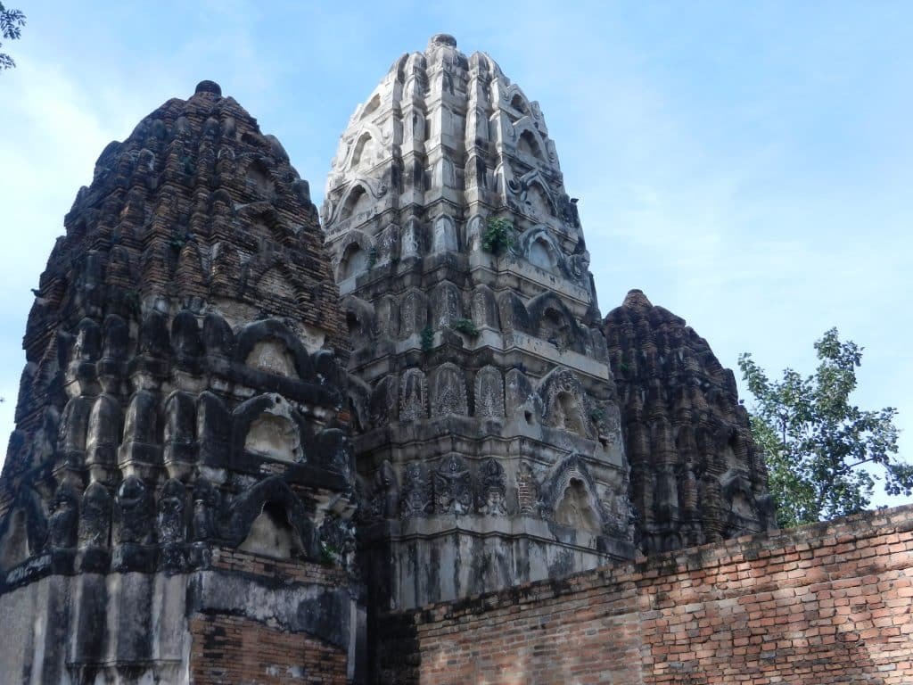 Thais and Cambodians share a long border, but like French and Germans, their cultures have dramatically different traits. Some of Sukhothai’s temples blend both. Wat Si Sawai proudly stands about 350 meters from Sukhothai’s ritual center, Wat Mahathat.