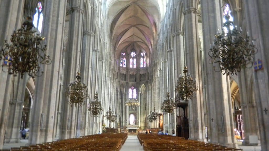 In the nave, rows of columns and arches repeat static geometric forms, but they lead the gaze towards the altar and Christ (the photo below is from the cathedral in Bourges).