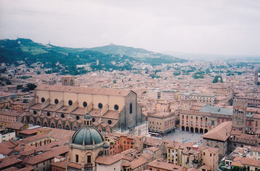Europe’s first universities were emerging. Scholars were congregating in cathedral cloisters and town squares. As the gatherings became regular, universities in Paris, Bologna, Padua, Salerno, and Oxford were established, and they awarded degrees. (Bologna is shown below, from the top of a narrow 310-foot-high tower house).