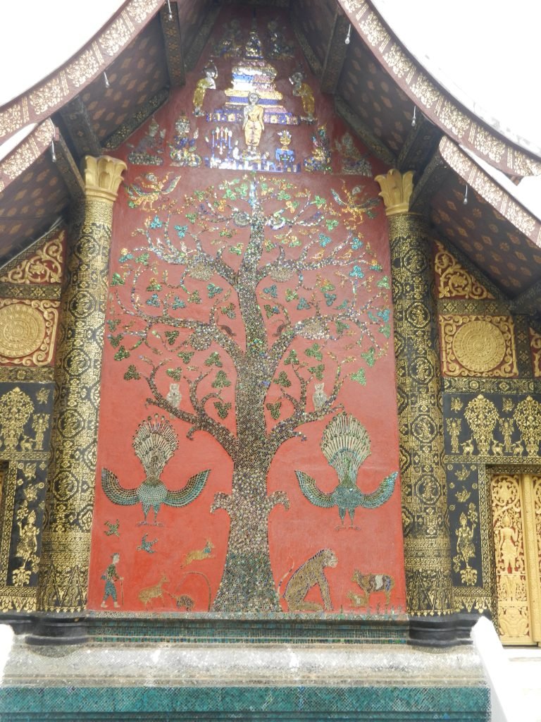 A mural of the cosmic tree graces the most honored temple in Laos (below). The Buddha preside above it. But though he said that people shouldn’t form attachments to the world, the tree takes up much more space, expressing joy in nature’s bounty.