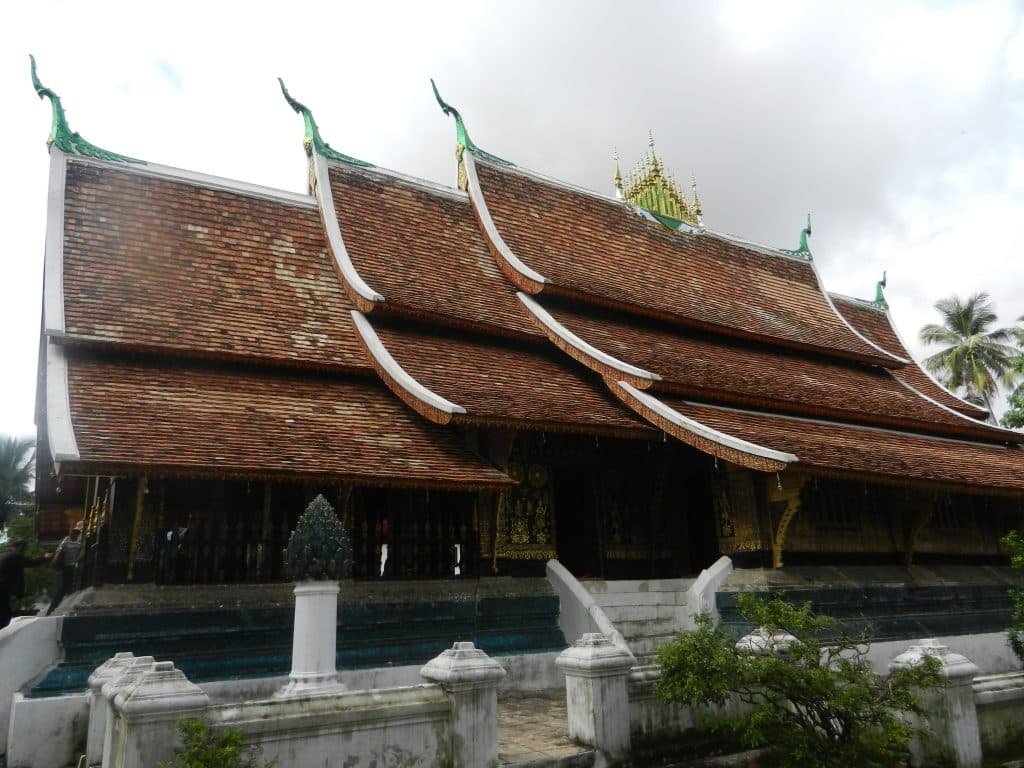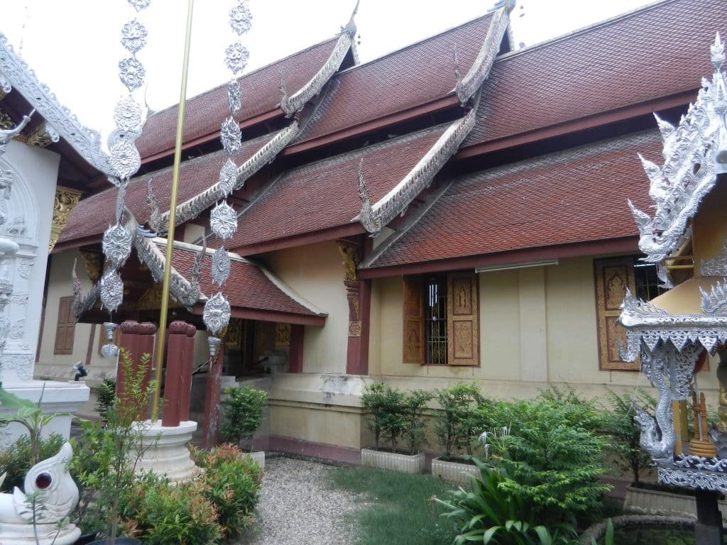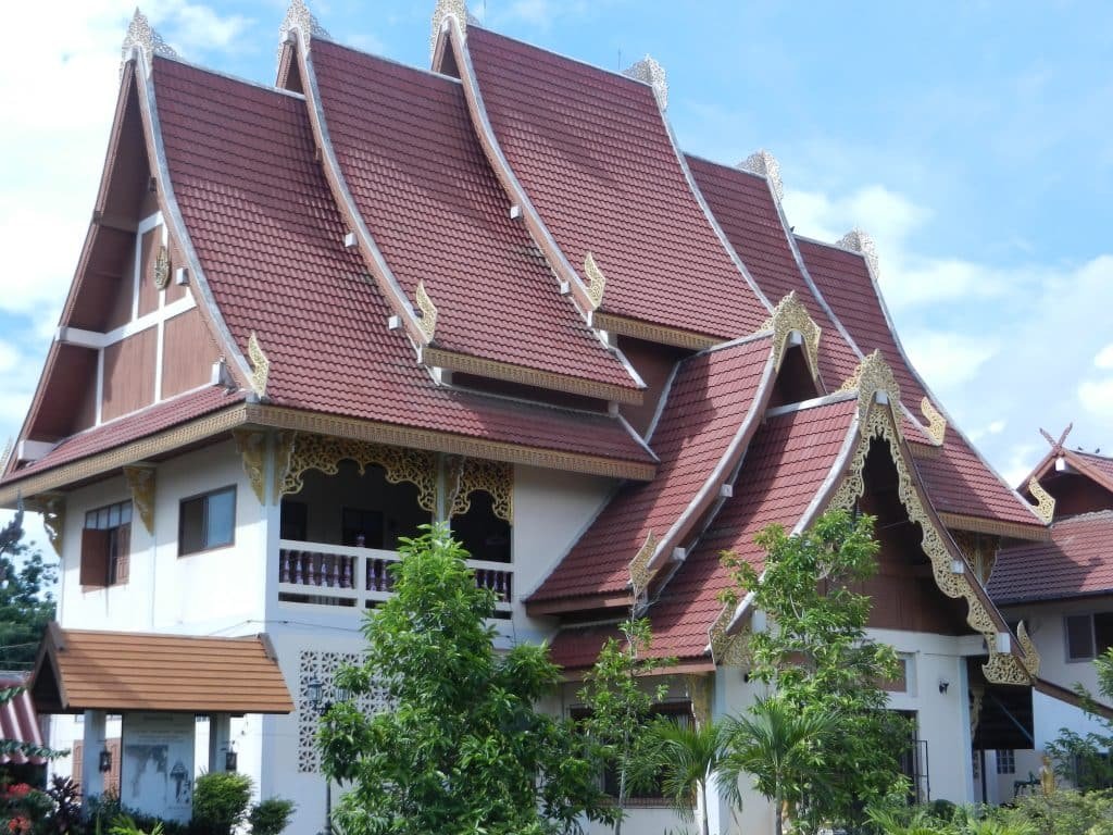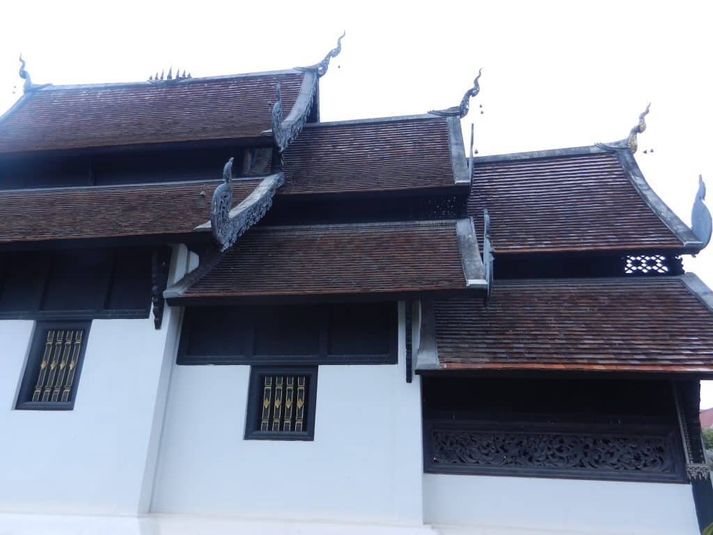 One of Lanna architecture’s most distinctive traits is the roof of the vihara (the public assembly hall), and it’s one of my all-time favorite art forms. There are usually three or five sets of them–one in the middle, and one or two radiating from each end. The middle stack is the highest, and the ends are the lowest. The above picture is a common example.