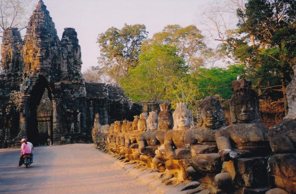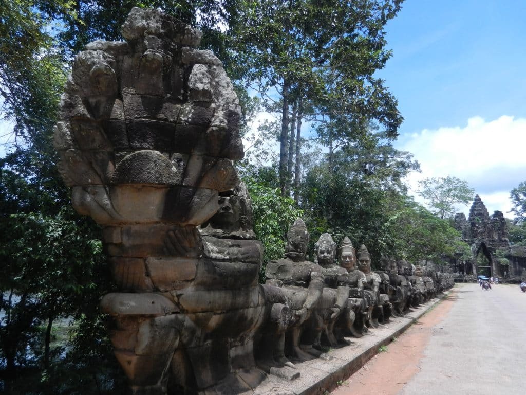 Fifty-four figures line each side of south road to Angkor Thom. The calm ones are gods and the others are asuras (demons). Both groups are pulling a giant snake called a naga (the seven heads of one greet visitors in the below photo).