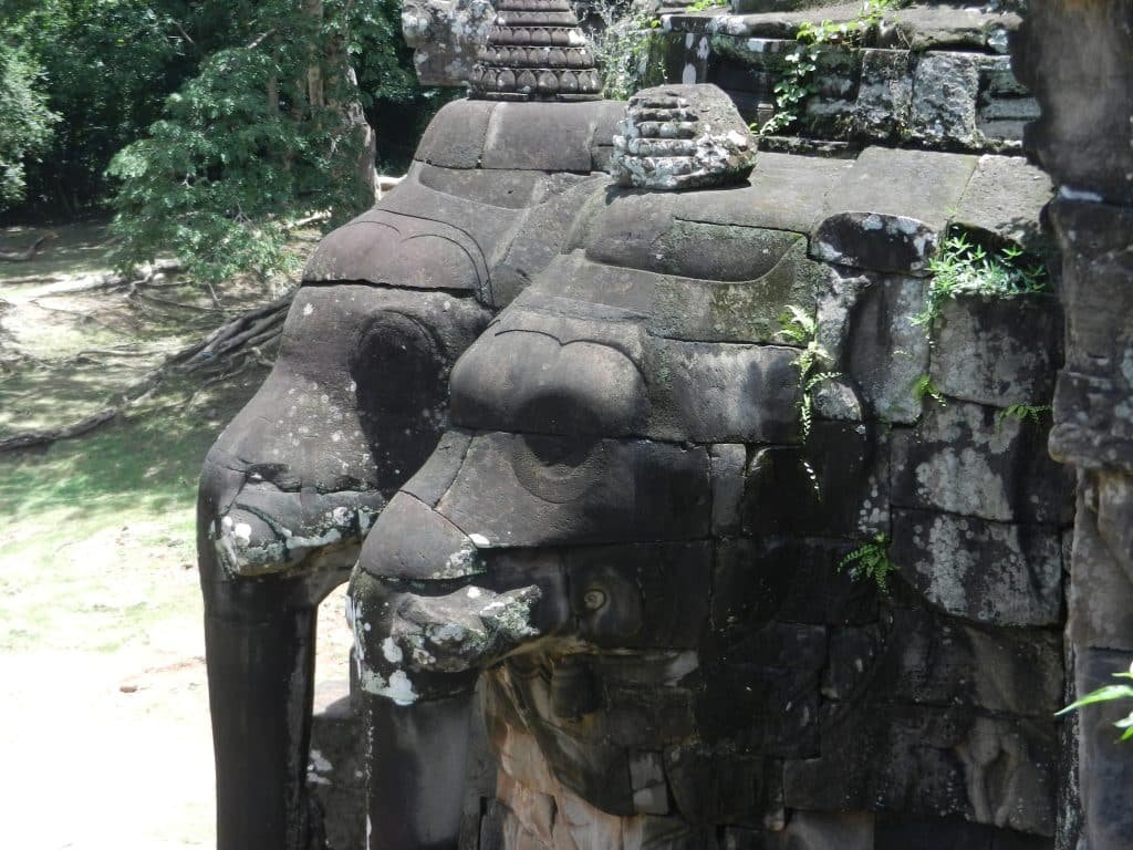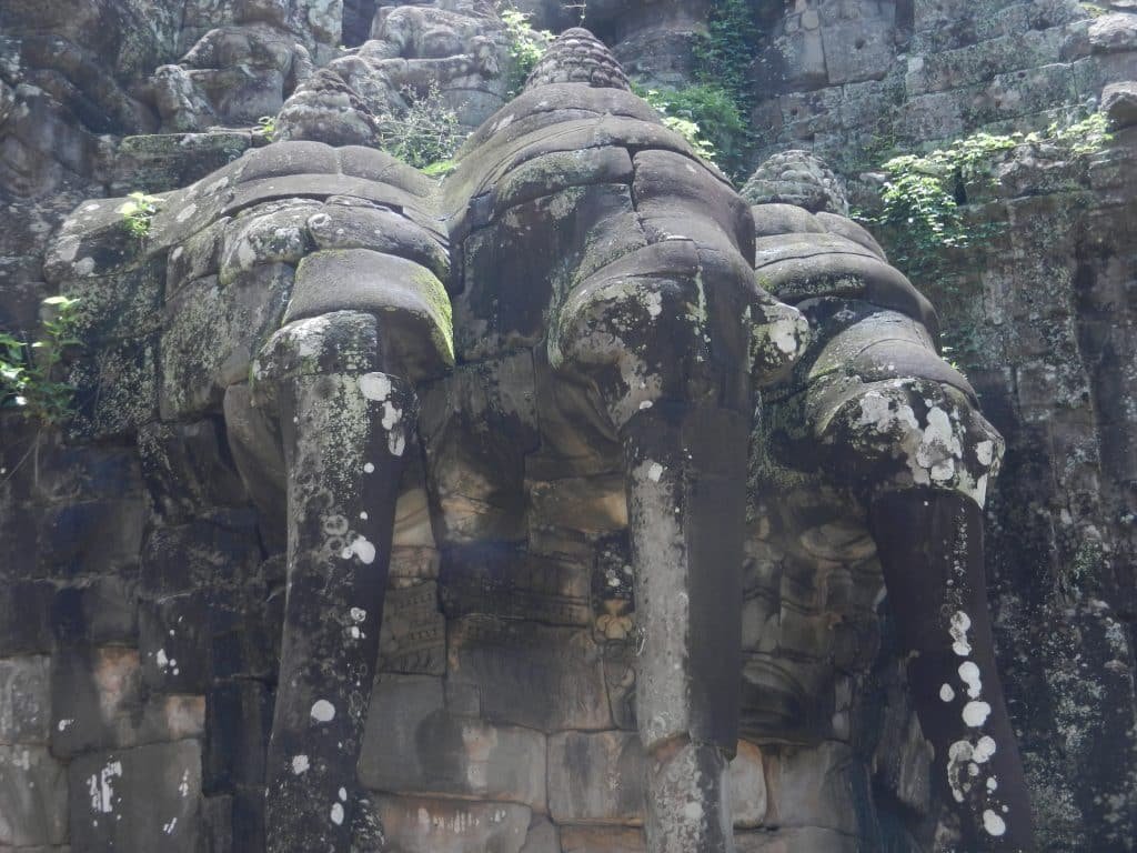 Some scholars have thought that they represent Jayavarman VII. Others have written that they embody Lokesvara, a Mahayana deity that represents the Buddha’s compassion and who helps keep the world in order between the Buddha’s passing and his next incarnation as Maitreya–Jayavarman became a Mahayana Buddhist. Jayavarman might have fused his identity with Lokesvara in these towers. Other ideas about the faces have been proposed too, but if they did represent a Buddhist deity, the entrance to Angkor Thom combined Hindu and Buddhist ideas into a sensational introduction to the royal city. The two following photos below are of one of the three-headed elephants that support the face towers; Khmers had portrayed the Vedic god Indra riding them for more then three centuries. This ancient image was closely associated with the coming of the annual monsoon, so it would have resonated with folks approaching Angkor Thom.