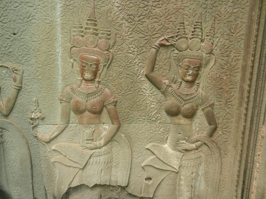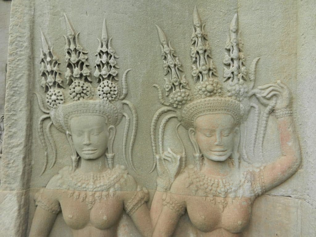 Female dancers who entertain gods balance the war scenes. Some are called apsaras and they reside in the heavens. Others are called devatas and they stand rather than fly. Both are the height of elegance, and they adorn courtyards, walkways, and towers throughout the temple.
