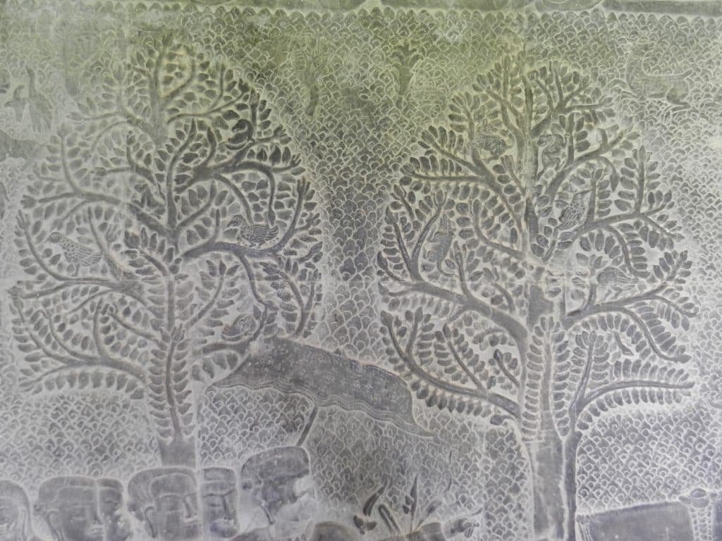 The reliefs’ styles also mix grace and force. Angkor Wat’s sculpture has been called classical because it’s elegant and elevated above daily life. Devatas are suave and charming, and some warriors in battle assume postures from classical Indian dance. But other figures have angular faces and they seem absorbed in their mythic worlds and detached from our concerns. Trees in many scenes bristle with dense and animated foliage as though they’re full of nature’s energy. The carvings are thus both courtly and infused with mysterious power.