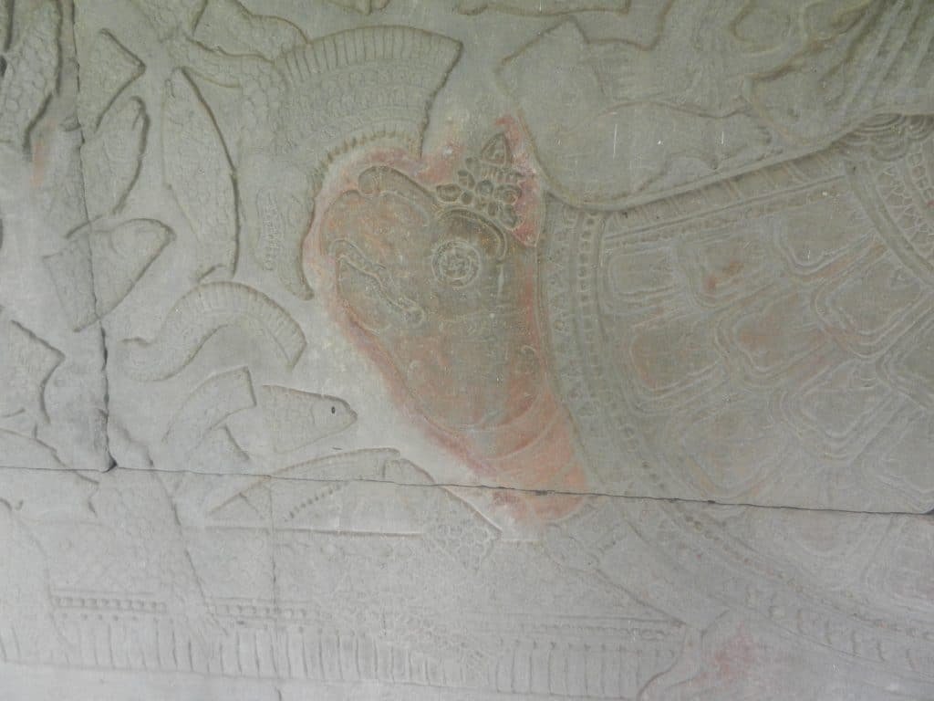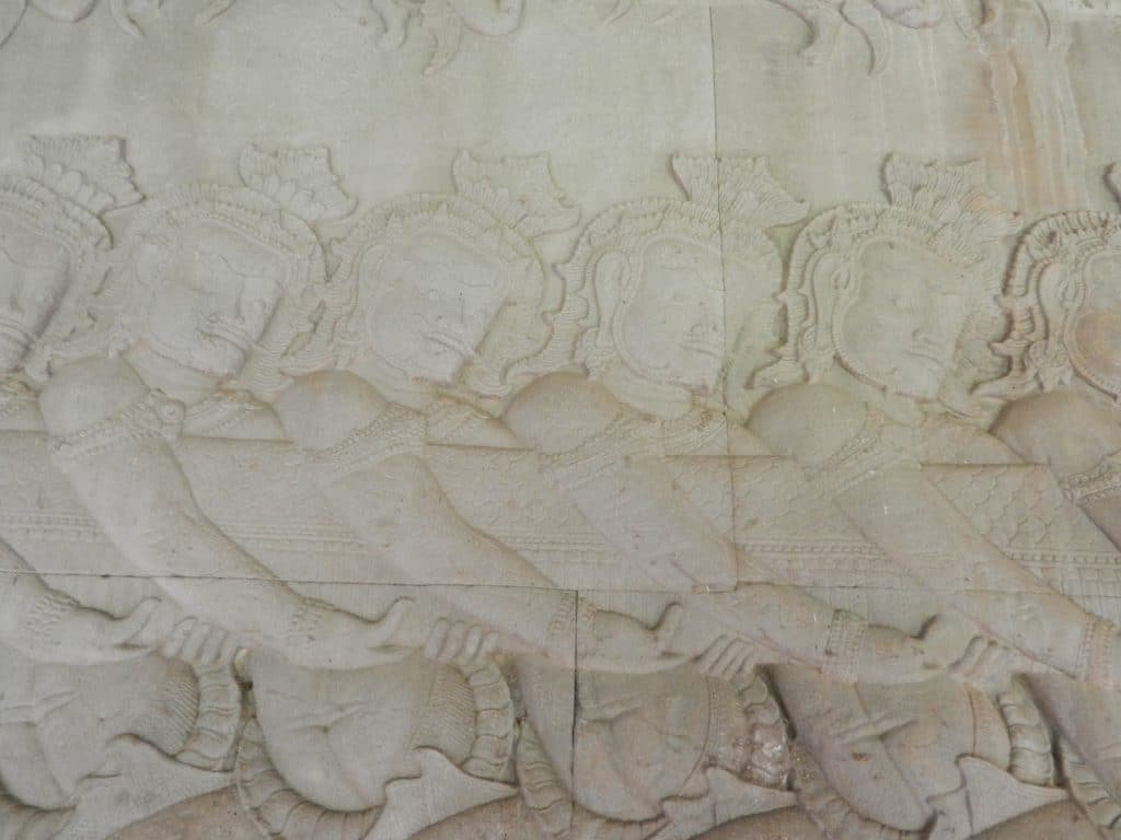 In the last post, we walked towards Angkor Wat’s center and explored some of the carvings on its central section, beginning with the west wall. The panel on the east wall portrays the universe’s creation, and it is one of Angkor’s most famous works of art. Its 150-plus-foot-long carving shows gods and demons (asuras) pulling a giant serpent from both ends.