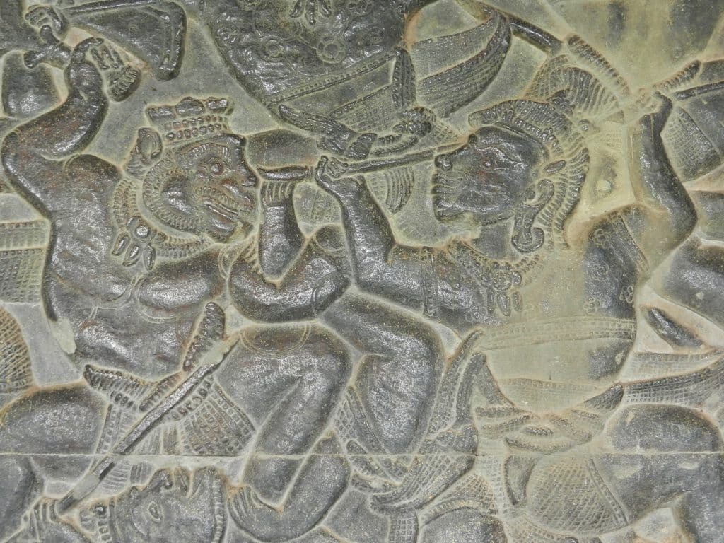 The carvings on the rest of the walls are mostly of battles between Hindu gods and their foes, and they include one of the most violent scenes in Asian art. This depiction of the Ramayana’s final combat climaxes in a whirl of destructive energy that flings bodies around like twigs.