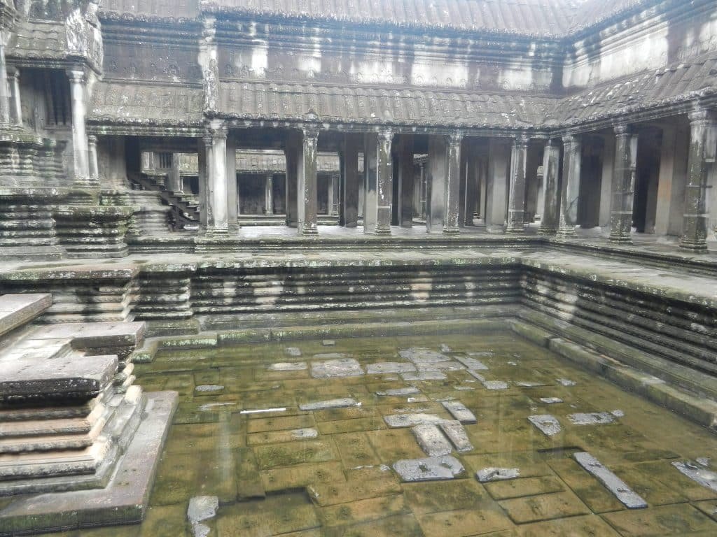 The pools were dry when I was there, but locals had placed large arrangements of orange flowers and banners in front of Buddha statues because Angkor Wat is now a Buddhist temple. The bright colors of ancient religious rituals and the interplays of light, water, and stone must have made this a ravishing place.