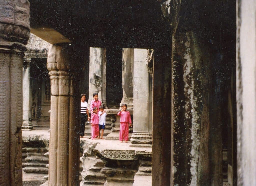 Gentle Cambodian families enhanced the harmony. Two local women and two five-or six-year-old children sauntered around the central tower, on top of the plinth that it stands on. Both kids smiled at me when they noticed that I was watching them. The conviviality, elegant architecture, breezes, and sunlight made everything around me sparkle.