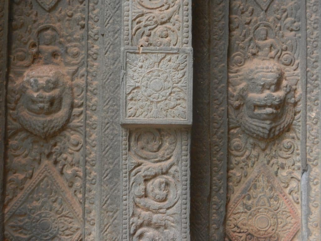 Every inch is densely carved–mostly with thick vegetal patterns, as the columns that flank Preah Ko’s doors are.