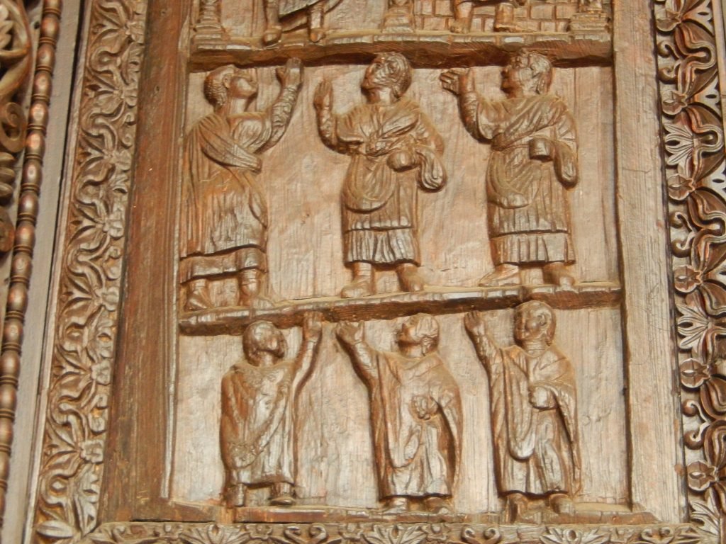 The classicist Peter Brown studied the growth of this concept of total personal commitment to divinity. Many saw it as a conversion in which a person threw away his old identity and was reborn. Some left their towns for the desert in Egypt and arid hills in Syria and Turkey for lives in monasteries or as hermits. St. Anthony was one of the most famous. This son of well-to-do Egyptian peasants attended church and heard that Jesus said, “Go, sell all you have and give to the poor and follow me.” Anthony took this literally and lived in the desert for many years, wearing a skin, refusing to bathe, and surviving on bread and water (a door carving on Rome’s Santa Sabina is pictured below).