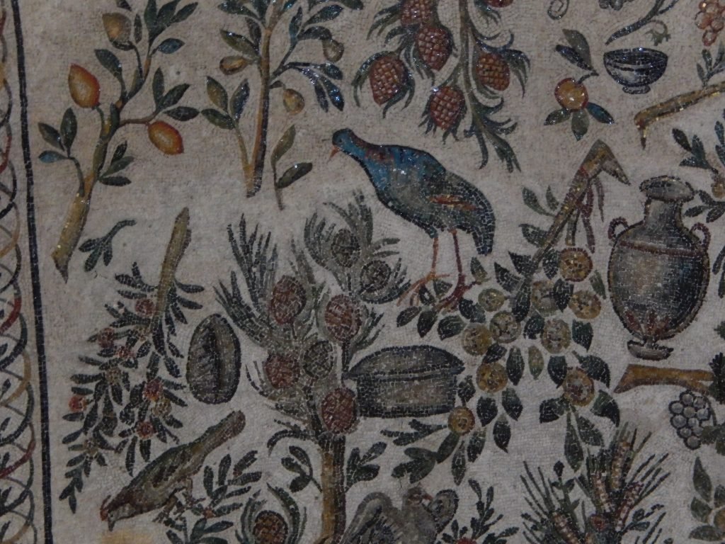 Mosaics cover the ceiling all around the church’s central altar. Pagan Roman mosaics were often lively and sometimes violent. But in her church the images tame nature’s abundance by showing classical balance.