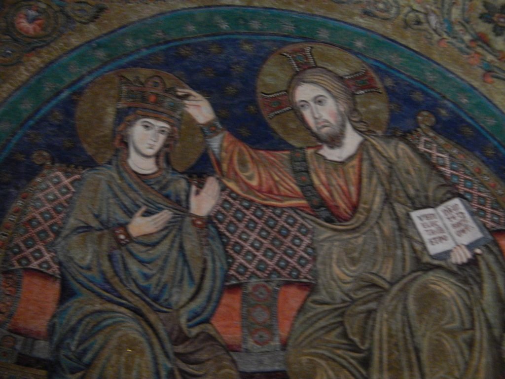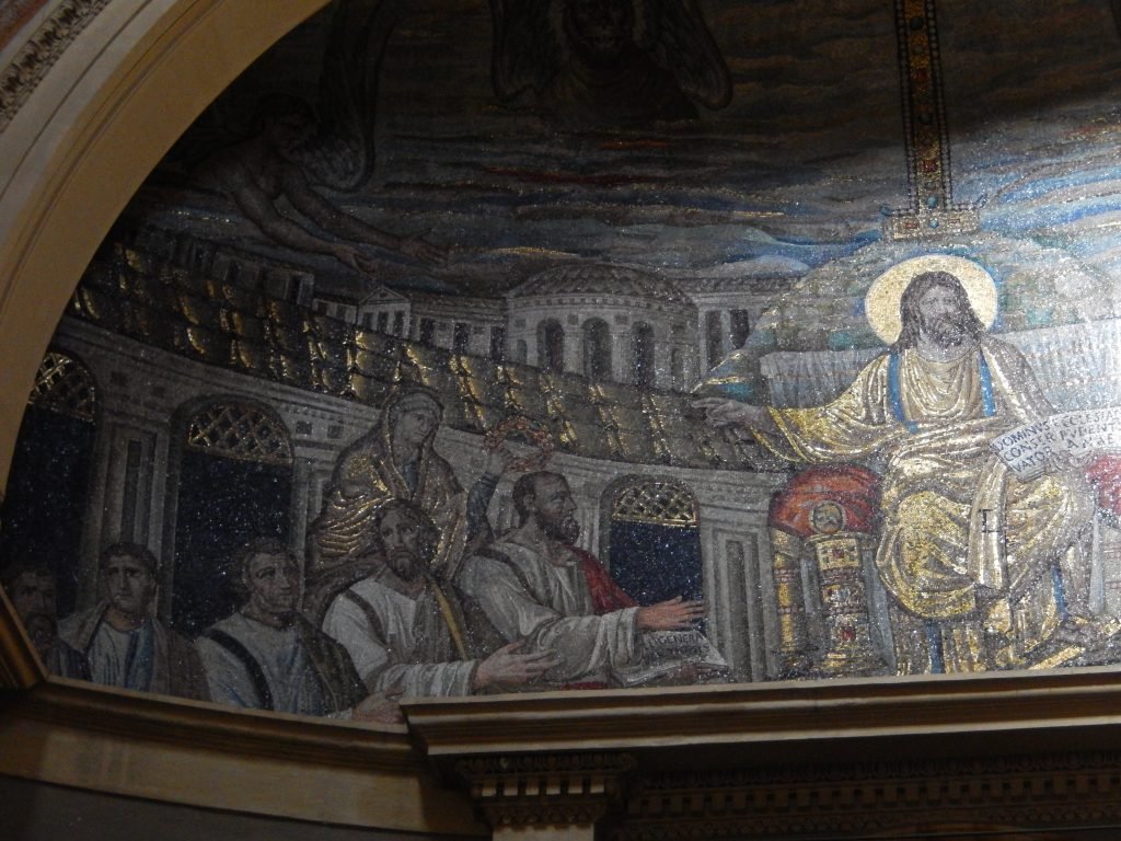 But he could also be rough. He upset the money changers’ tables in the Temple in Jerusalem. Of course he got violent for a good reason. Those scorpions were cheating impoverished people who were coming to worship. They were mocking religion and taking advantage of the faith of the weak. Jesus was gentle when he could be and tough when he needed to be, but he always behaved like the ideal human being. The Gospels portrayed the man who was inspired by God with details that people could relate to. He was both spirit and flesh. The mosaic over the altar in Rome’s Santa Prudenziana (below) shows him in a dignified urban setting. His followers look like senators.