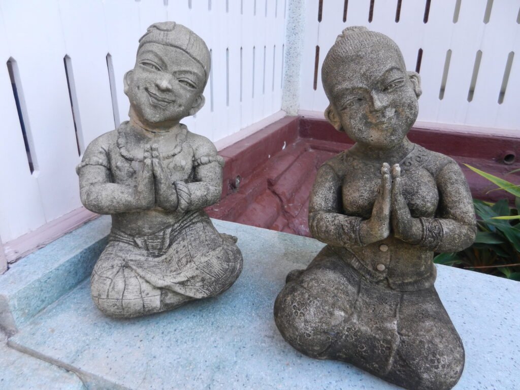 But Southeast Asians have appreciated a human-scale environment. Many traditional societies have sharply distinguished what is safe from what’s dangerous. People associate the former with the family (especially Mother, who is often seen as a paragon of virtue), the temple, and the rice-farming community. They envision them within a circle of safety and identify the latter with zones beyond its embrace, particularly the howling forests and mountains. Within the safe world, they have created an endless variety of beautiful rituals, artistic objects, and rules of etiquette to maintain the ties that keep people together. Although Buddhist temples are supposed to connect people with ultimate reality and facilitate liberation from the cycle of births and deaths, many are full of pleasing images and little objects that provoke smiles, like these two fellows that greet visitors in a northern Thai temple.