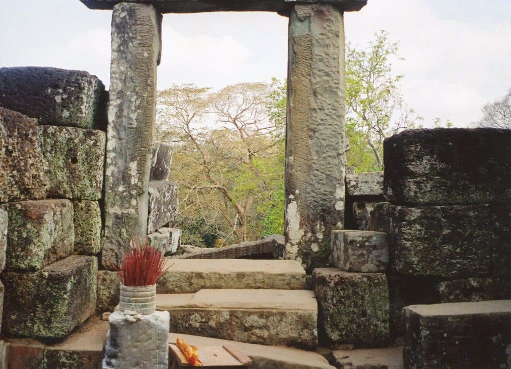 She represented a naga princess who transformed into a beautiful woman. Some Khmers and Chinese residents believed that this ritual fertilized the kingdom because it was a meeting of the ruler’s celestial power with earthly energies. But if it was enacted on this pyramid, it wasn’t a casual fling. The room at the top is about 50 feet above the ground, and the steep stairs render the climb and descent a bit dangerous. I found it surprisingly small. There’s no area for frivolities, but only enough space to lie down (I’m in the room’s center in the below photo).