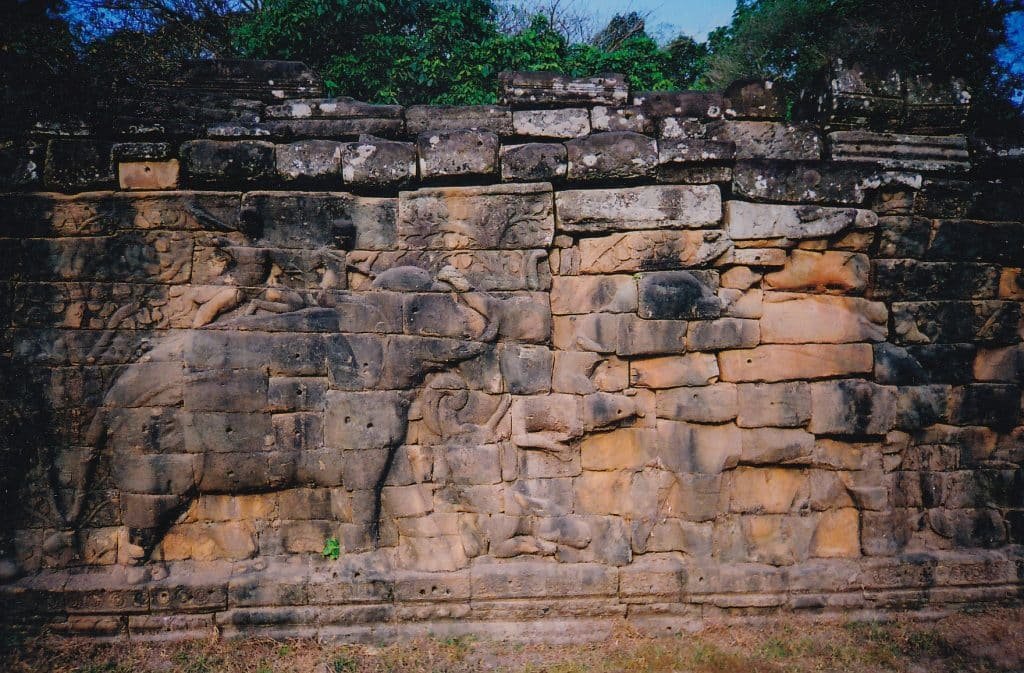 Men positioned on their backs chase tigers, buffaloes, and boars. This wall, called the Elephant Terrace, was probably the base of royal reception pavilions where the king and courtiers watched the festivals.