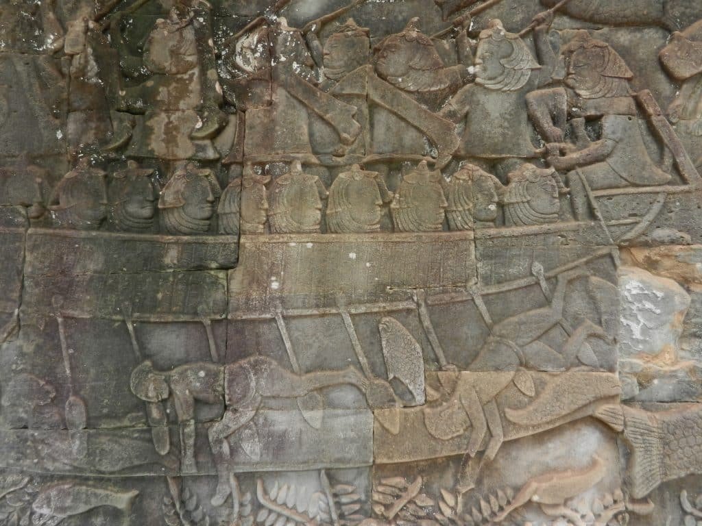 But some historians, including Vittorio Roveda and Michael Vickery, have thought that there’s no convincing evidence for a great naval battle with the Cham. Some inscriptions say that the Cham came by land in carts. Roveda thinks that these Bayon scenes are of a mock battle that the Khmers staged during a festival which commemorated the Khmer victory.