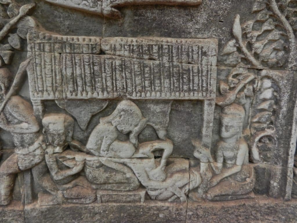 Other scenes on the Bayon also have medicinal themes, like this one of a woman in labor. Khmers put a lot of drama into their sculpture–at Banteay Srei, and Angkor Wat, and many other temples. The above Bayon scene shows the mother as contorted as warriors in battle. Two reposed women frame her and give her comfort.