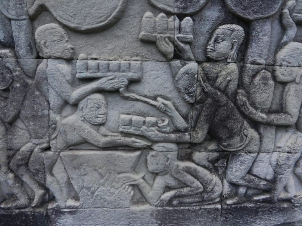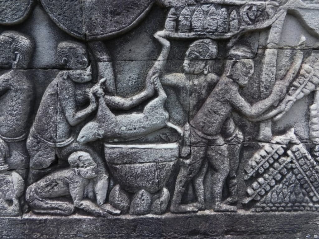 These folks are preparing a feast. The Bayon has many scenes that are festive.