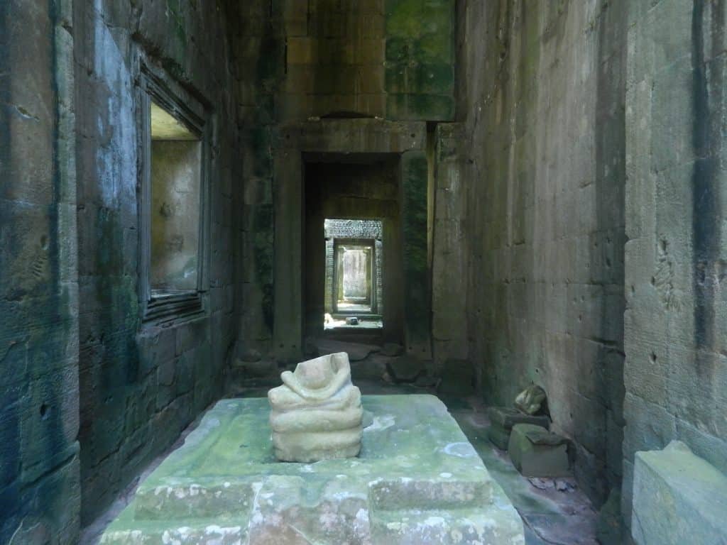 But the gods’ living quarters were cramped. There was no place within the central section’s network of halls and shrines with a view of more than a fraction of the whole complex. After I walked through the Hall of the Dancers, the construction became denser. The central tower isn’t nearly as lofty as Angkor Wat’s and the Bayon’s. The latter two monuments also limit each perspective to a fraction of the whole when you’re in one of the courtyards, but they draw your gaze to the middle spire, which symbolizes the heavens. But because the symmetry in Jayavarman’s two establishments is strictly horizontal, it doesn’t as strongly encourage people to visualize a loftier place that integrates the universe. Both complexes combine regularity with obfuscating complexity and otherworldly elegance. Each had several small courtyards that were combined into a square pattern, like the one in Phrah Khan.