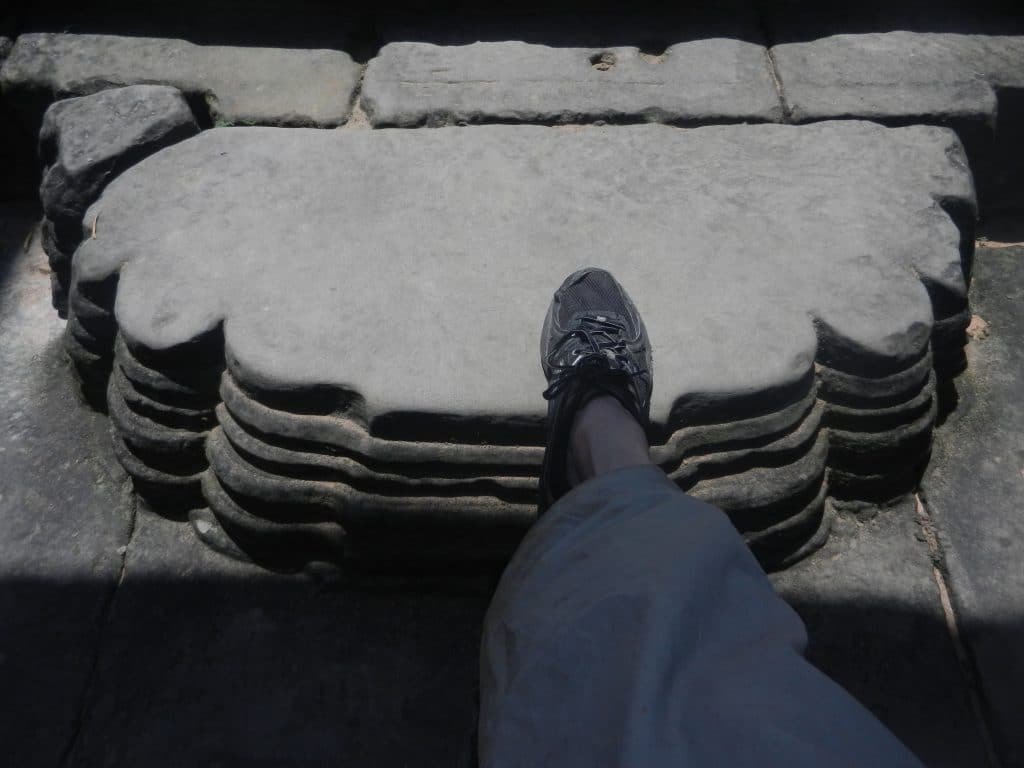 The lower steps of many Khmer temples from Preah Ko to Jayavarman VII’s works elegantly curve into a point in the middle so that they resemble lotus blossoms and flames when you look down on them. The architects of these two complexes surely didn’t imagine my old sneakers treading on these sacred spaces.