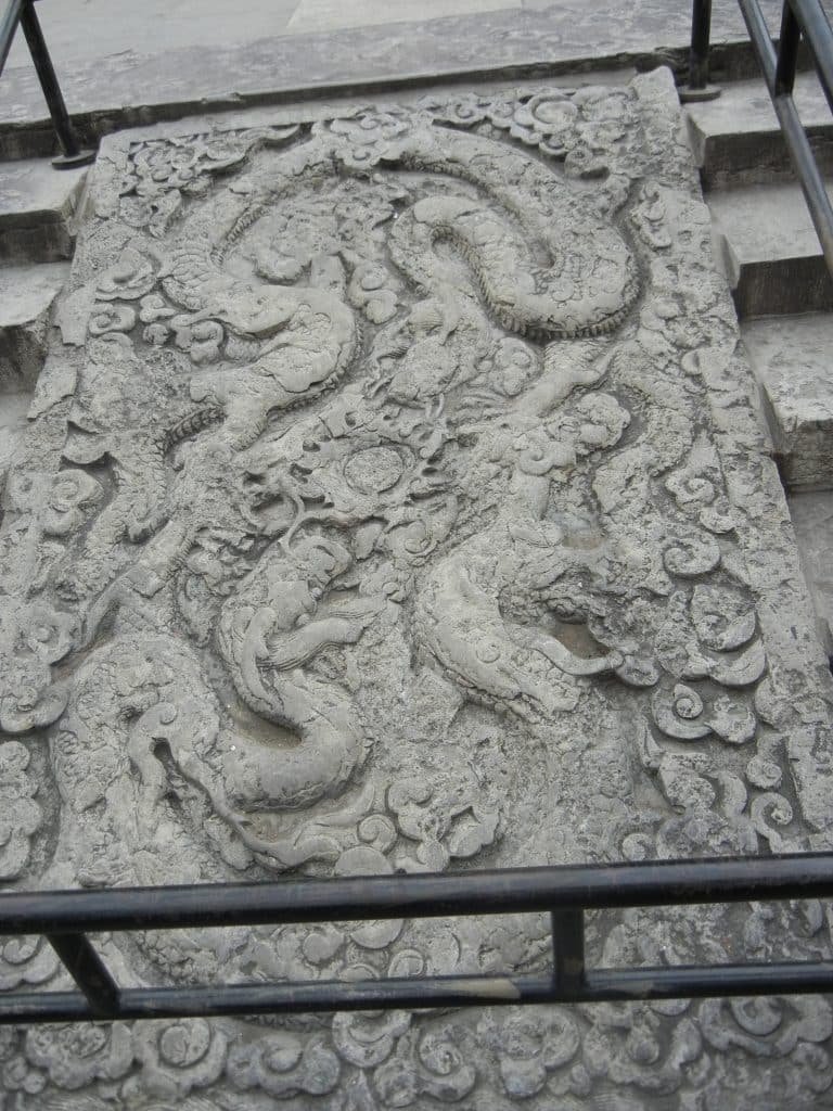 The stone slab between the steps to the Confucian temple’s main hall repeat the dragon pattern. Beijing’s Forbidden City has several of these too–the emperor didn’t need to feel ashamed about his.