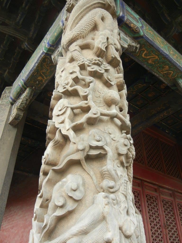 But the Confucian temple’s columns are carved from bottom to top with a pattern of two dragons playing in the clouds. The entire column seems infused with energy that flows smoothly throughout.