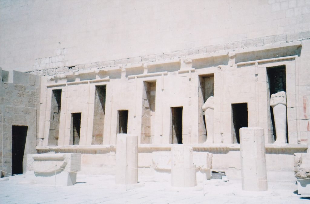 At the back of the court, a large sanctuary for Amun was carved into the cliff. It received his sacred barque during the annual Beautiful Festival of the Valley. Nine cult niches flanked each side of it (below–the chapel for the royal court begins on the left).